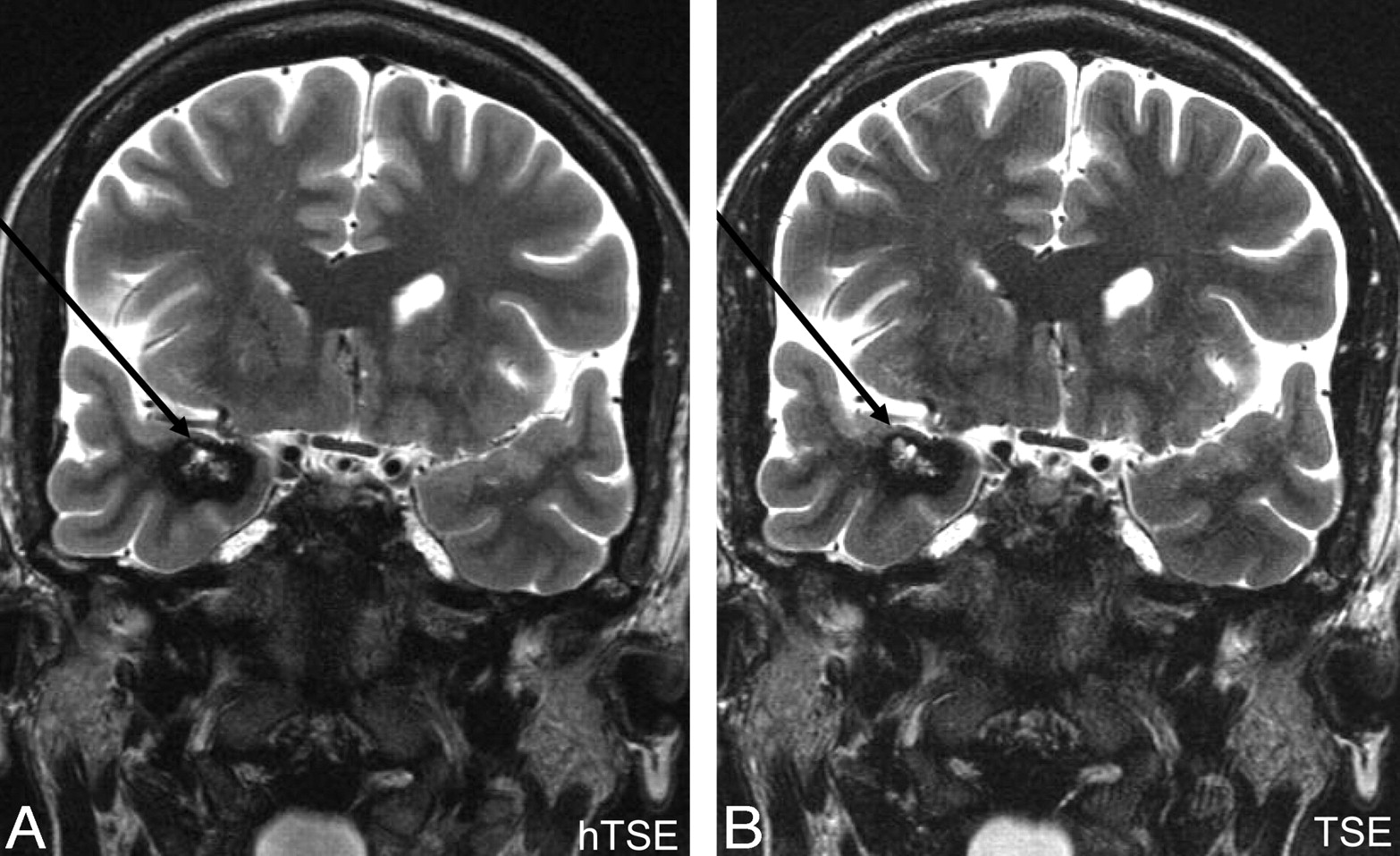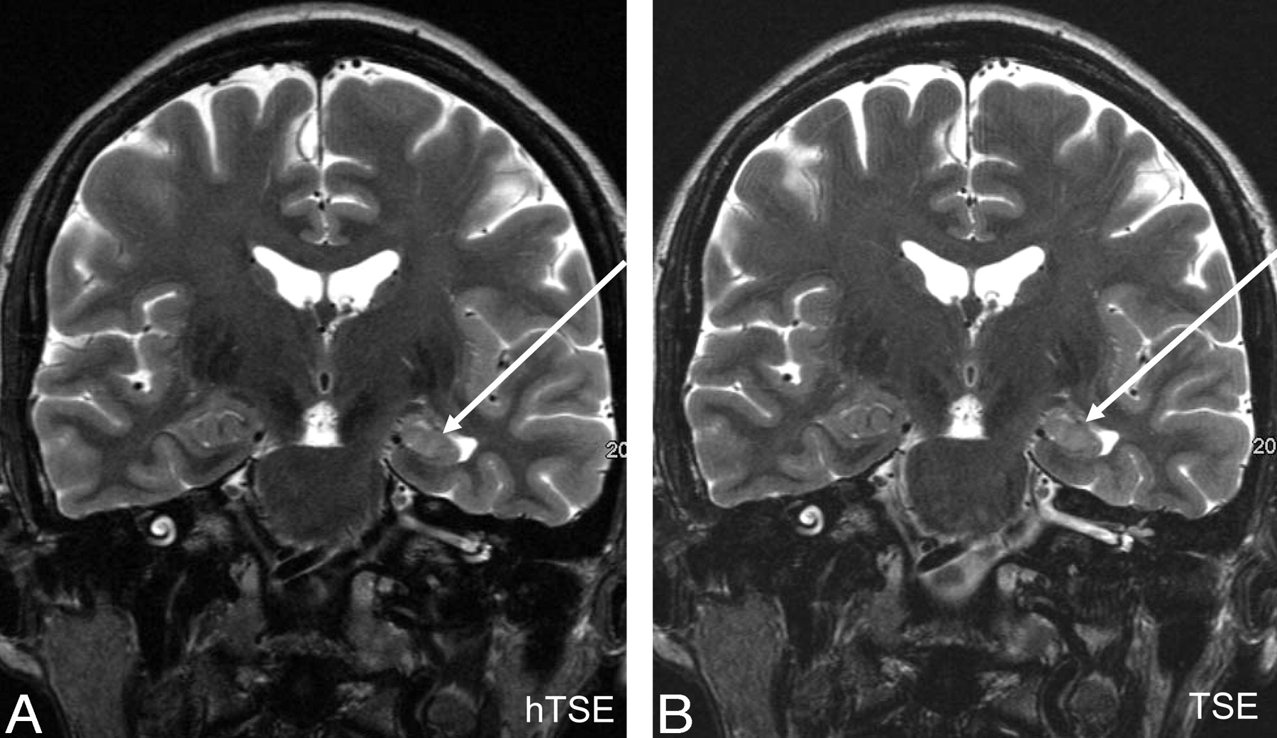 A, hyperTSE (hTSE). B, TSE180°. The left hippocampus is atrophic and has increased signal intensity attributed to hippocampal sclerosis (arrows). This finding was confirmed by surgery. The right hippocampus shows the typical dentation, and the particular layers are visible on both sequences.