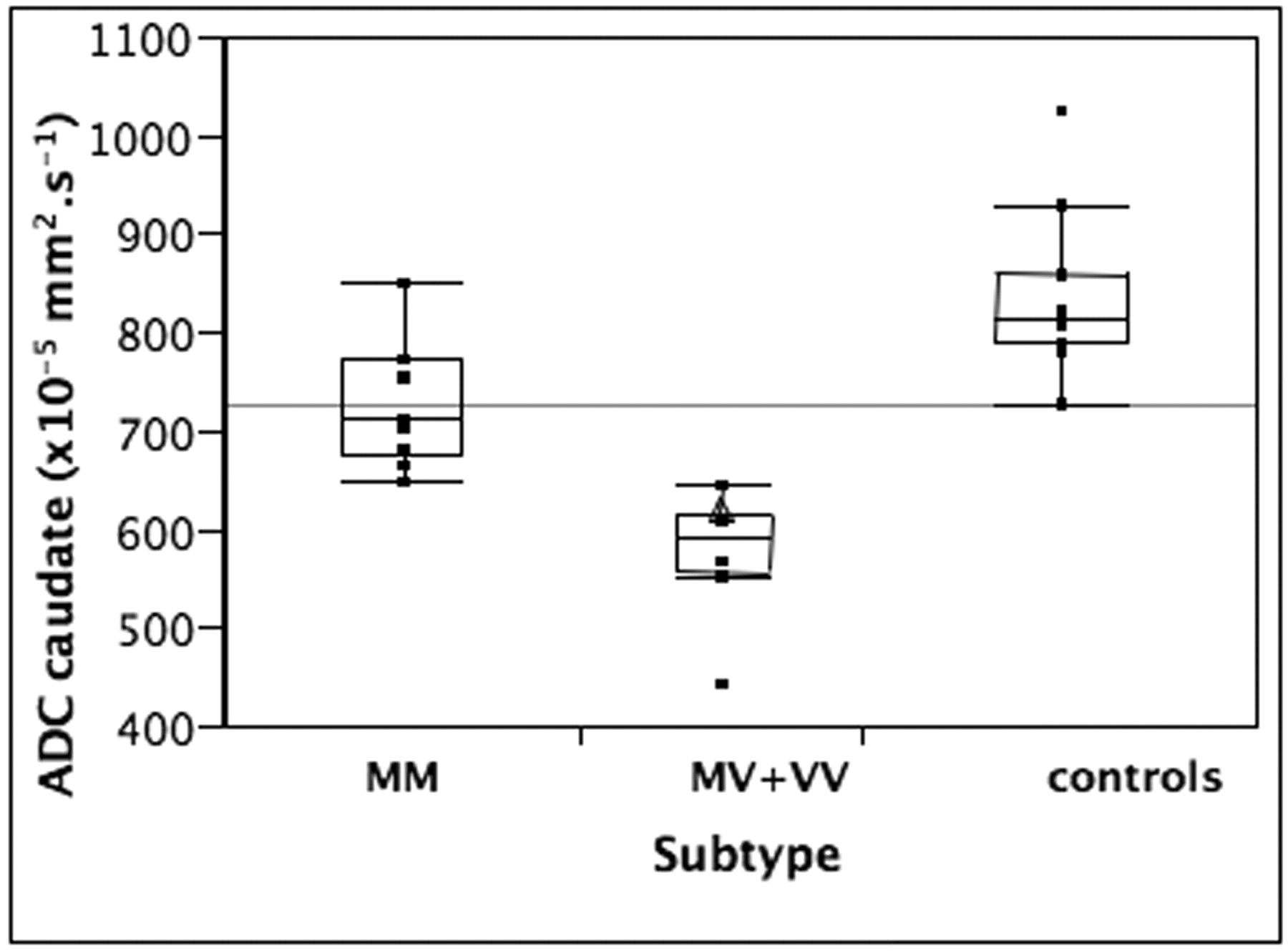 We prospectively studied 20 patients with CJD (6 pathology-proved and 14 probable) and 10 age-matched controls. The codon 129 genotype was available for 15 subjects, who included 1 VV, 8 MM, and 6 MV subtypes. The MR imaging protocol included both fluid-attenuated inversion recovery (FLAIR) and diffusion sequences (DWI, b = 0, 500, 750, and 1000 s/mm2). In these patients, we found the same high frequency of lesions (15/15 on FLAIR and DWI), both on the cortex (13/15 on FLAIR, 15/15 on DWI) and on the basal ganglia (10/15 on FLAIR, 12/15 on DWI). The frequency of involvement of the striatum was similar on DWI in MM (6/8) and MV (5/6) genotypes. In addition, ADC values measured on the deep brain structures were significantly lower in patients with the MV and VV genotypes as compared with MM patients (P < .03 in the caudate, lenticular, and pulvinar nuclei; χ2 test). The difference was striking in the caudate nucleus, where ADC values were significantly different between controls and MM and MV/VV patients, with a clear-cut separation between MM and MV/VV patients (Fig 1). ADC values were not significantly different between controls and MM patients in the lenticular nucleus, despite the presence of signal-intensity changes on DWIs in 75% of these patients. These findings support a combination of different pathologic processes to explain the hypersignals observed on DWI, inducing increased and/or decreased diffusibility and emphasizing the added value of ADC measures to distinguish in vivo between molecular subtypes of CJD.