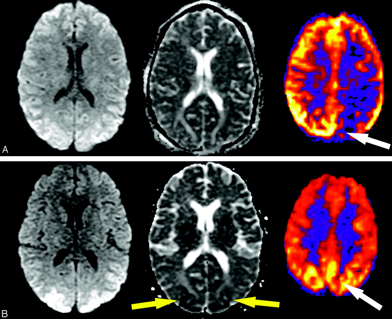 Evolution of perfusion changes in PRES in a 31-year-old woman. A, Initial images: high signal intensity on the initial diffusion-weighted image (left) represents T2 shinethrough secondary to edema seen on the apparent diffusion coefficient (ADC) images (center) in the occipital cortices. A corresponding ASL map (right) reveals marked flow asymmetry with hypoperfusion in the left occipital lobe (white arrow). B, At 2-week follow-up, diffusion and ADC images show new posterior restricted diffusion (yellow arrows), and bilateral hyperperfusion is now evident on perfusion images (right, white arrow).