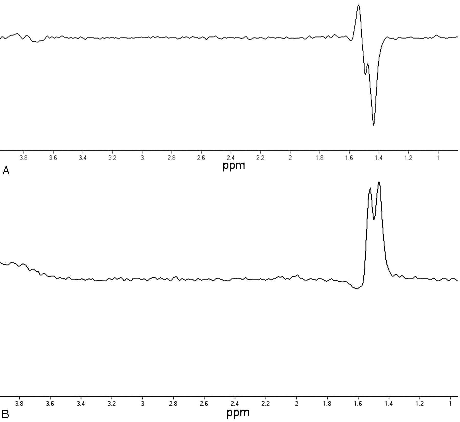 Spectra from a phantom that contained 10 mmol/L of alanine to illustrate the anomalous J-modulation effect of the PRESS sequence at TE = 144 ms obtained from a 3T scanner, with the identical setting in the receiver gain at TE = 144 (A) and TE = 288 ms (B). Note at 1.47 ppm the incompletely inverted phase and reduced amplitude of the methyl doublet in the TE = 144 ms spectrum, evidence of the presence of an anomalous J-modulation effect.