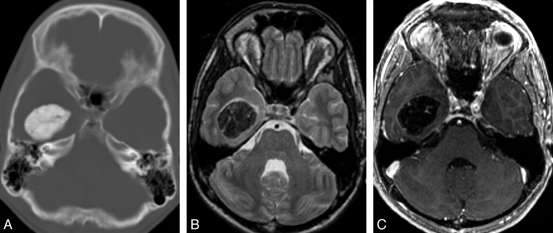 Typical radiologic features of extra-axial CAPNON. A, Noncontrast CT scan shows a densely calcified mass in the right temporal horn. B, Axial T2-weighted MR image shows a uniform T2 hypointense mass centered in the right temporal horn. C, Axial T1-weighted postgadolinium sequence illustrates marked T1 hypointensity with scattered linear areas of enhancement that correspond to the strands of T2 hyperintensity. This appearance was seen in both of our larger lesions and may correspond to the vascular stromal elements seen within these lesions.