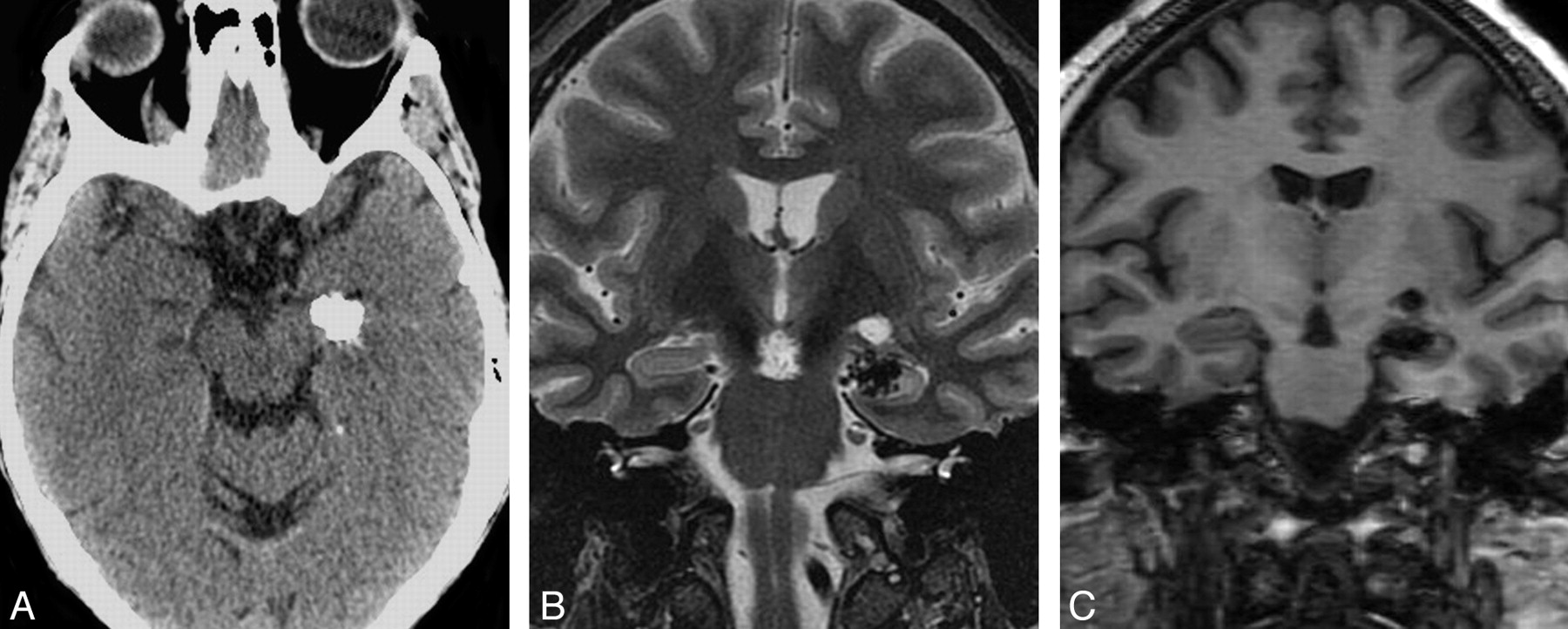 Typical radiologic features of intra-axial CAPNON. A, Noncontrast CT scan shows a left hippocampal mass with attenuated calcification. B, Coronal T2-weighted sequence demonstrates T2 hypointensity with a nodular border. C, Coronal T1-weighted sequence shows the typical T1 hypointensity. Preoperatively, this lesion was thought to represent a cavernous malformation. In retrospect, the nodular contour on T2 and lack of internal T2 hyperintensity would be atypical for a cavernous malformation of this size.
