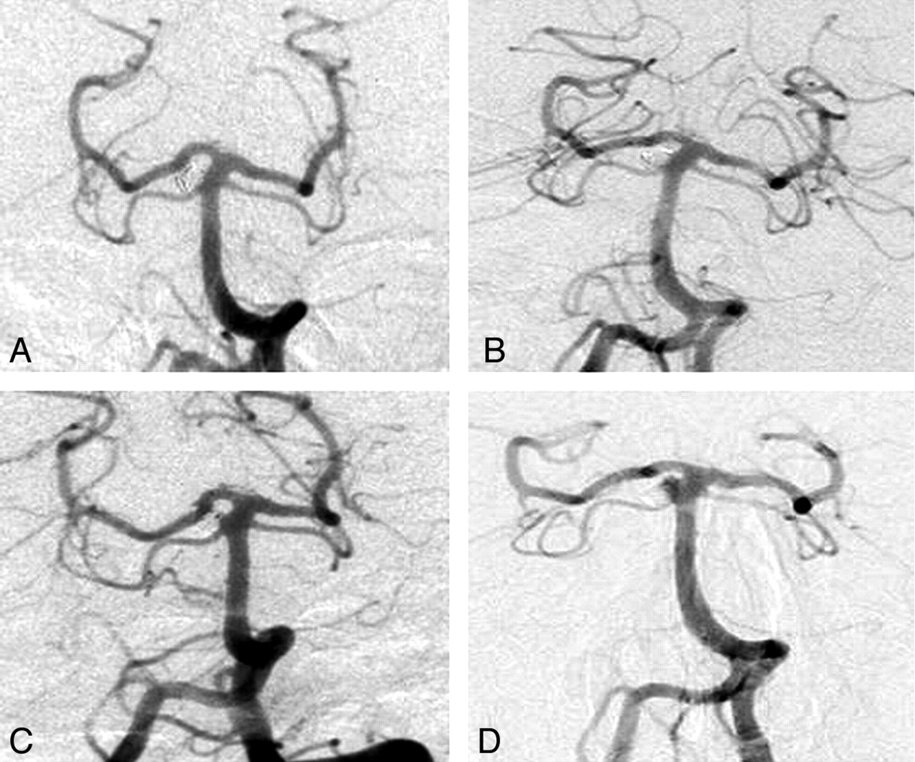 Angiograms show satisfactory occlusion postcoiling (A) and stability at 2 years (B), only to have the aneurysms recur (minimally) 4 (C) and (significantly) 6 years later (D).