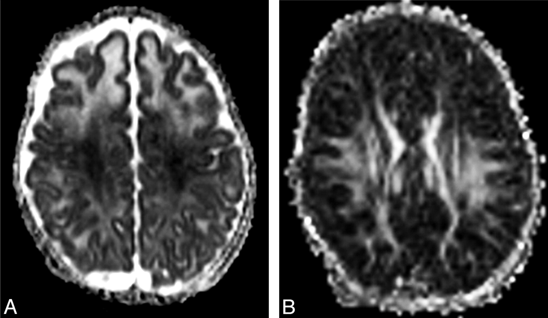 A, Apparent diffusion coefficient (ADC) map demonstrates decreased signal intensity in the perirolandic white matter and centrum semiovalia. ADC value, measured in the left centra semiovale at the MR imaging workstation (Syngo; Siemens, Erlangen, Germany) is reduced (0.87 × 10−3 mm2/s); in an age-matched control (not shown), ADC measured in the same location was 1.4 × 10−3 mm2/s. Note also increased water diffusion in the remaining hemispheric white matter, with frontal predominance, suggestive of interstitial edema. B, Fractional anisotropy map shows increased anisotropy in the perirolandic white matter and centra semiovalia.
