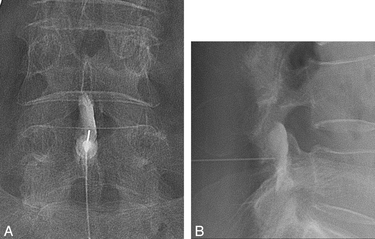 A 70-year-old woman received an interlaminar ESI. A 22-ga spinal needle was advanced into the posterior epidural space through the interlaminar space with intermittent injection of contrast agent until the contrast agent smoothly spread into the lumbar epidural space on anterior-posterior view (A) and lateral view (B). Then, a mixture of triamcinolone acetonide (Tamceton) and bupivacaine hydrochloride (Marcaine Spinal 0.5% Heavy) was injected into the epidural space.