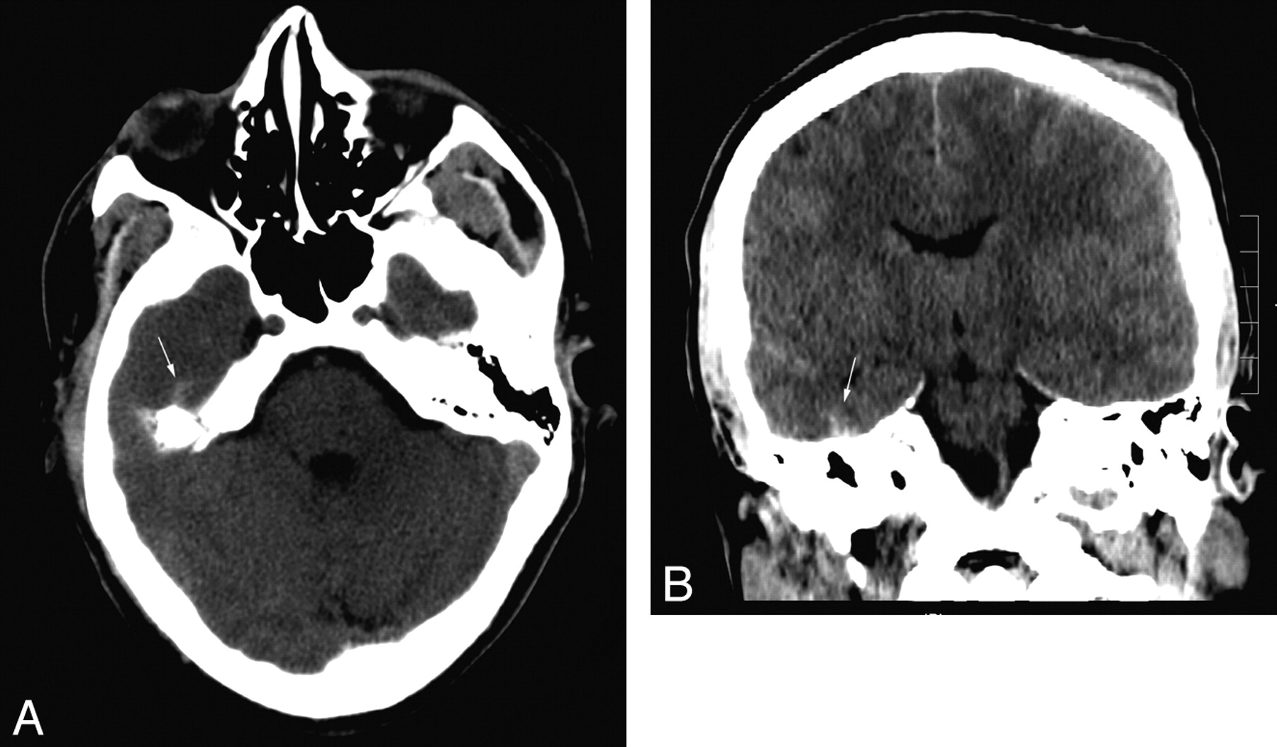 A, A small focus of pneumocephalus (arrow) is related to a nondisplaced fracture through the left temporal bone. B, On the axial images, the findings are obscured due to volume averaging through neighboring mastoid air cells (arrow).