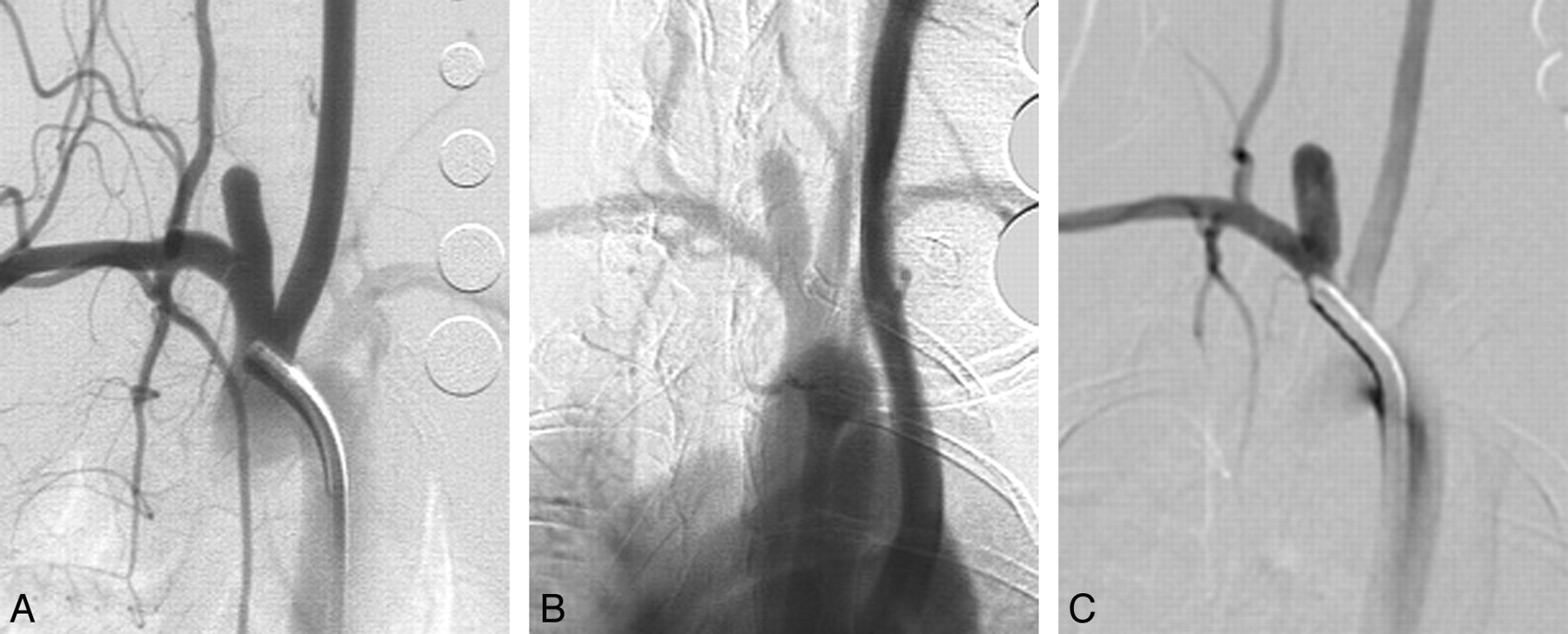 Serial DSA in an elastase-induced aneurysm. A, AP IADSA obtained 1 month after creation demonstrates an aneurysm cavity along the brachiocephalic artery, at the origin of the ligated RCCA. B, AP IVDSA in the same aneurysm 2 years after creation. C, AP IADSA in the same aneurysm 5 years after creation. Aneurysm dimensions remain constant throughout follow-up.