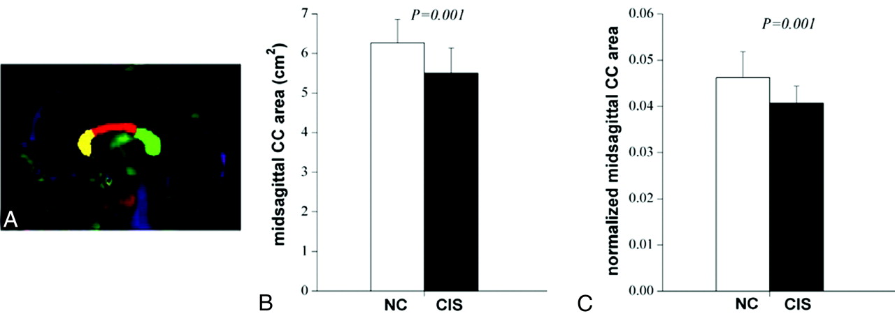 The size of the midsagittal CC for NC and CIS suggestive of MS groups. A, One example of midsagittal CC and its subregions (yellow indicates the genu; red, the body; green, the splenium). B, The midsagittal CC area for the 2 groups. C, The normalized midsagittal CC area by midsagittal brain for the 2 groups.