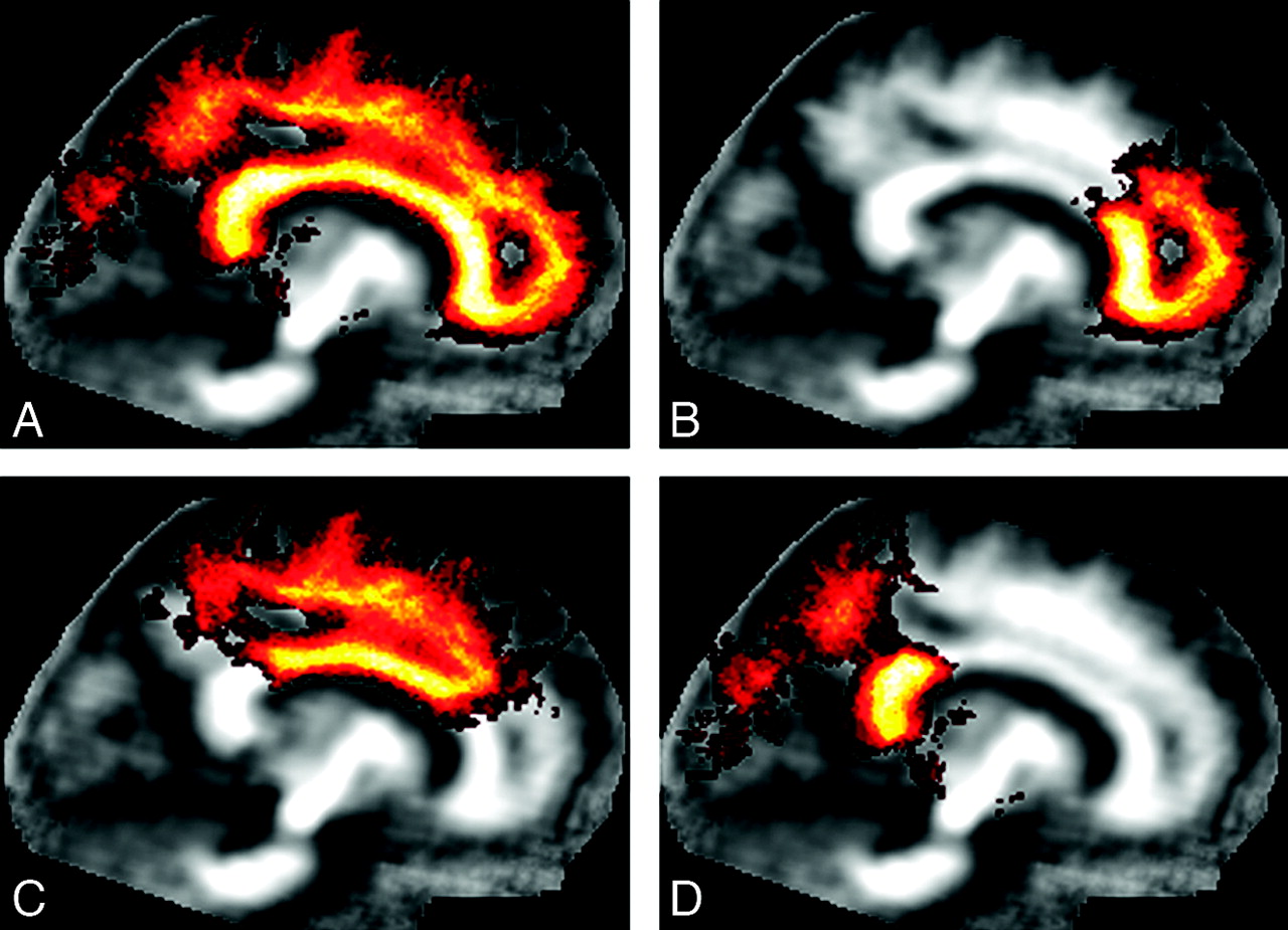 The probability maps for the entire CC and its subregions. A, The entire CC probability map. B, The genu probability map. C, The body probability map. D, The splenium probability map. The gray-scale overlay indicates the probability of a voxel being part of the CC or its subregions.