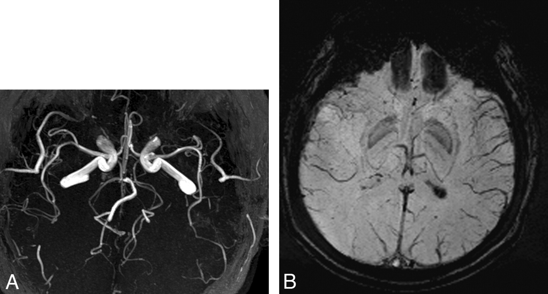 A, Normal findings on MRA 2 days after attack. B, Normal SWI finding 2 days after attack.