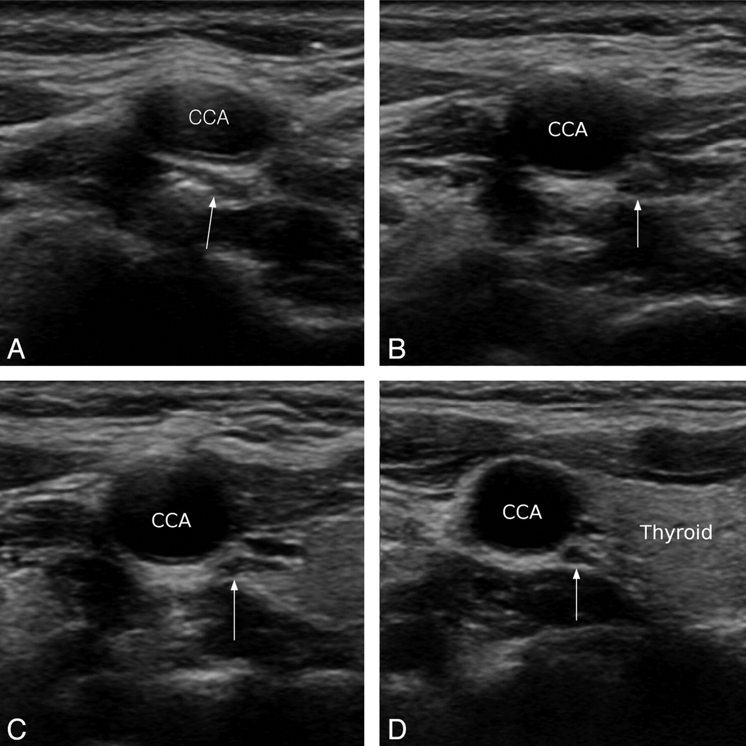 Medial variation of the VN in transaxial ultrasonography. A, VN changes its course under the CCA (arrow). After it changes course, the VN is located medial to the CCA and is close to the thyroid gland until it enters the thorax (B–D).