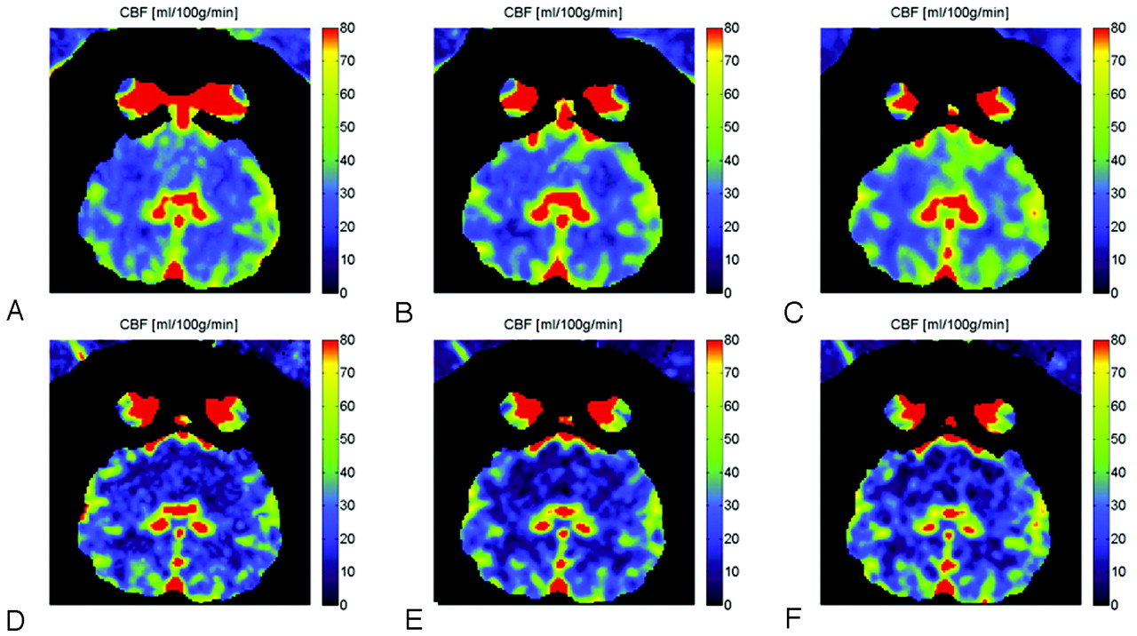In this study, only healthy pigs were considered. It is expected that in case of acute ischemic stroke, the CBF values will be lower22 than those in the healthy patient. This would correspond to slower tissue enhancement and hence a better opportunity to get good temporal sampling of the data. Further investigation is required to test the limits of the reproducibility of the CBF measurements for high-flow values.