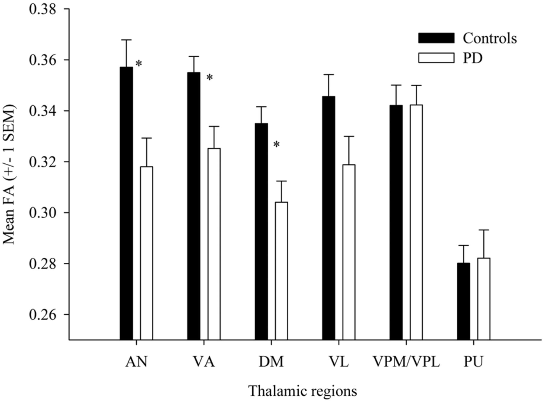RESULTS: FA values were reduced significantly in the fibers projecting from the AN, VA, and DM, but not the VPL/VPM and PU, in the PD group compared with the control group. In addition, there was a reduction in FA values that approached significance in the VL of patients with PD. These findings were consistent across both raters.