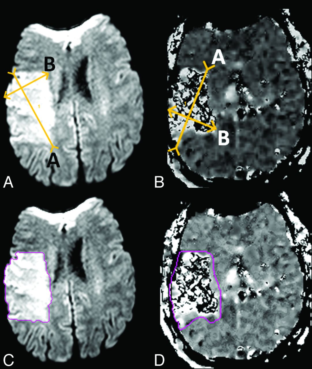 Corresponding measurements for the ABC/2 method (A, DWI = 116.1 mL; B, MTT = 194.7 mL) and planimetric method (C, DWI = 116.2 mL; D, MTT = 248.4 mL) on paired sections placed independently by 2 different readers.
