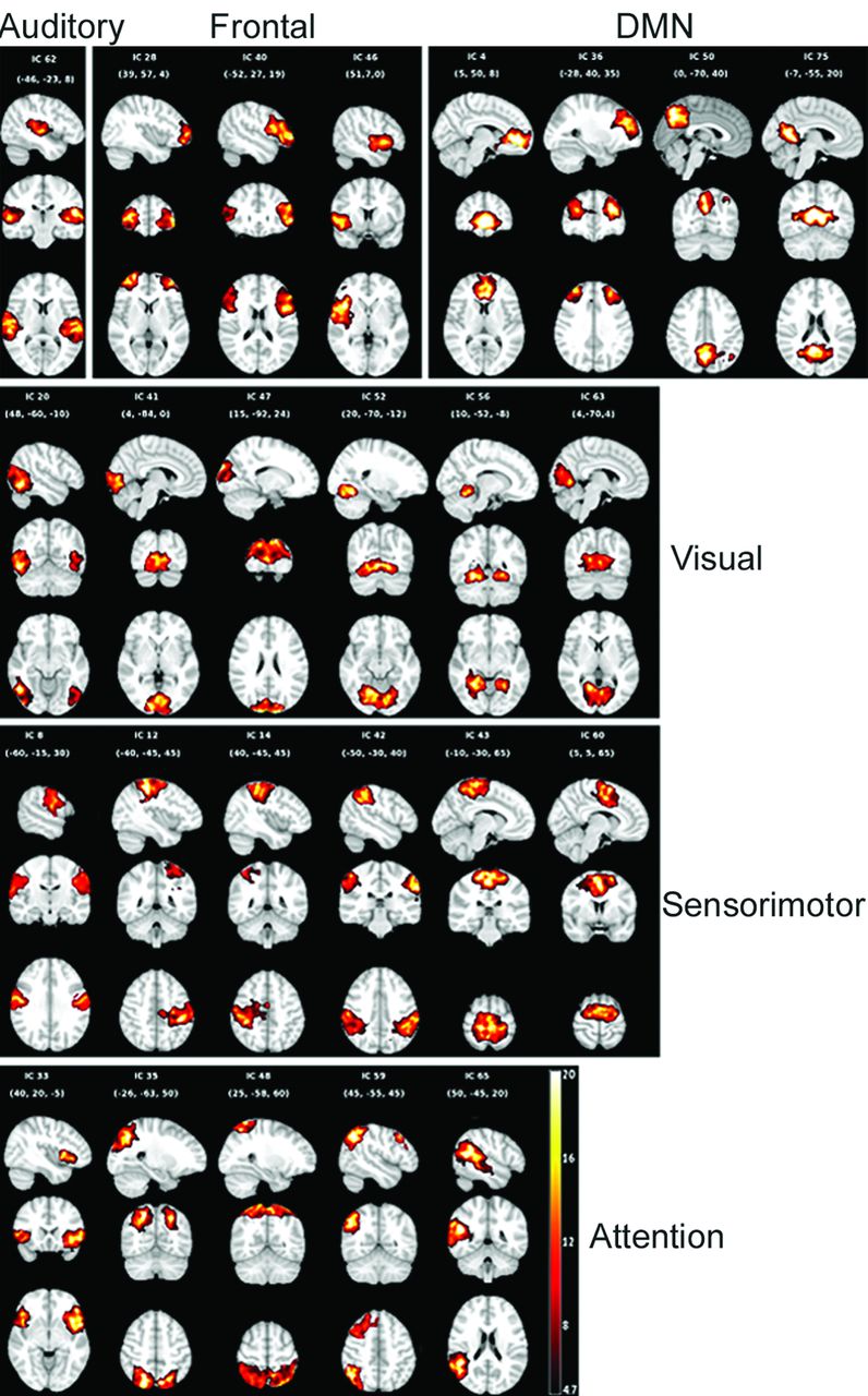 Spatial maps of the components identified as resting-state networks. Spatial maps are plotted as T-maps and overlaid on Montreal Neurological Institute 152 template. Top row (from left to right) shows the auditory, frontal, and default mode networks. Second, third, and fourth rows represent the visual, sensorimotor, and attention networks.