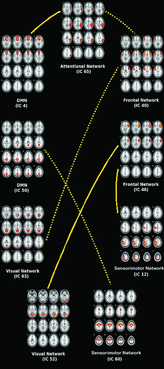Functional network connectivity between resting-state networks. Group comparison of pair-wise independent components shows reduced FNC (solid line) between DMN-attention (IC4-IC65), frontal-sensorimotor (IC46-IC12), and frontal-visual (IC46-IC52) networks in patients and increased FNC (dotted line) between frontal-attention (IC40-IC65), DMN-sensorimotor (IC50-IC60), and frontal-visual (IC40-IC63) networks in patients relative to control subjects.