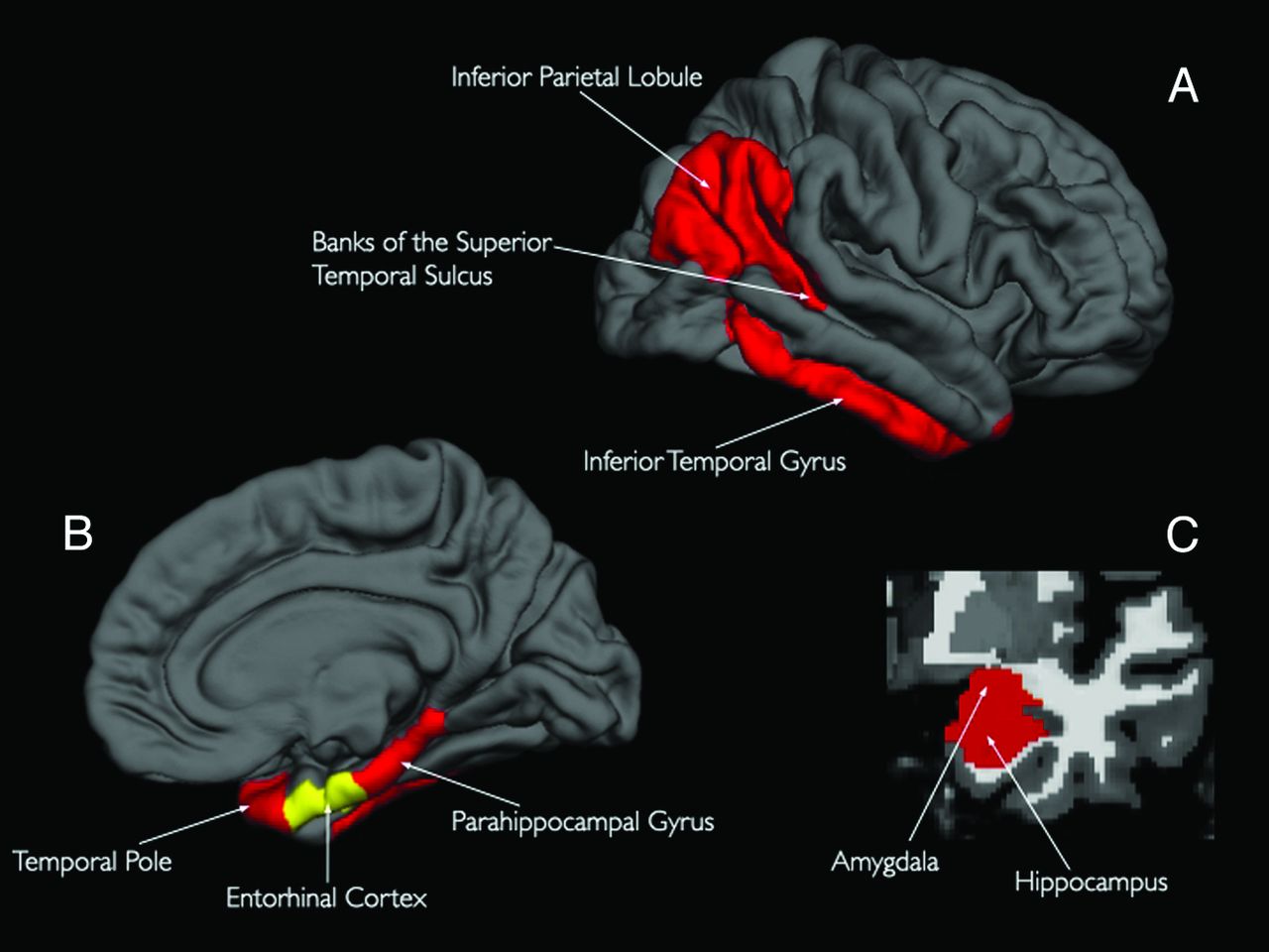 3D representations of the neuroanatomic regions examined in the current study (only 1 hemisphere is shown). All of the neocortical regions are visible in the lateral (A) and medial (B) views of the gray matter surface, and the 2 non-neocortical regions (ie, the hippocampus and amygdala, C) are visible in the coronal view of a T1-weighted MR image. Regions illustrated in red constitute the AD-vulnerable region of interest (for further details please see text).