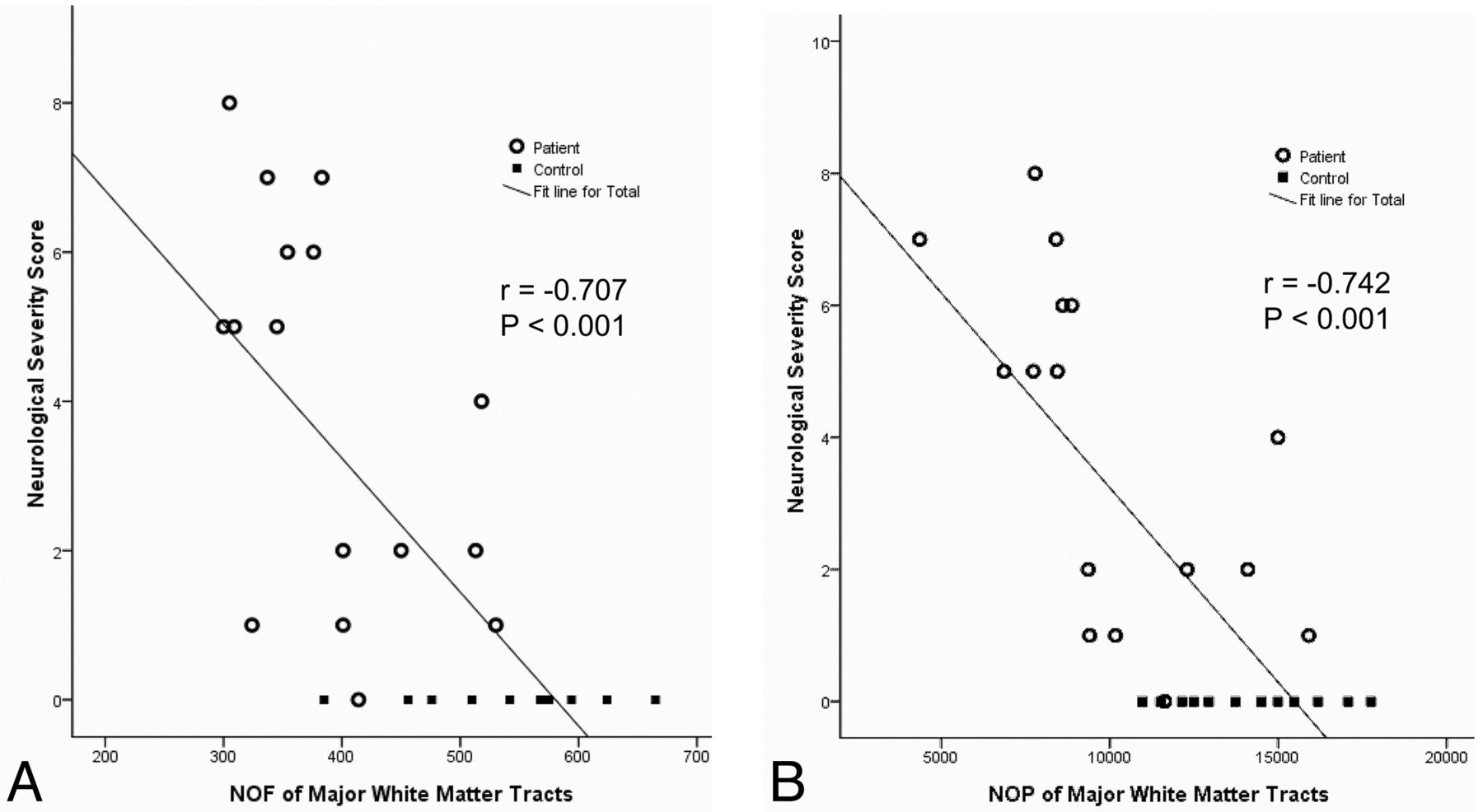 RESULTS: NOP and NOF of CF, bilateral PF, and MWT in the tuberous sclerosis complex group were all significantly lower than those in the control subjects (P < .05). The neurologic severity score was moderately negatively correlated with NOF and NOP regarding CF (r = −.70; r = −.75), bilateral PF (r = −.66; r = −.68), and MWT (r = −.71; r = −.74). Tract-based spatial statistics revealed that patients with tuberous sclerosis complex showed a widespread reduction (P < .05) in FA and axial diffusivity in most cerebral white matter regions.