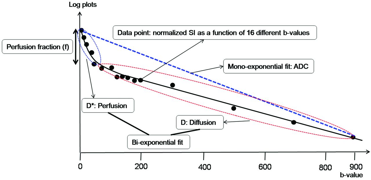 where S is the mean signal intensity; S0 is the signal intensity without diffusion; a pseudodiffusion coefficient D* can be defined, which describes macroscopically the incoherent movement of blood in the microvasculature compartment; a perfusion fraction, f, describes the fraction of incoherent signal that arises from the vascular compartment in each voxel over the total incoherent signal; and D is the diffusion parameter representing true molecular diffusion (the slow component of diffusion) (Fig 1).