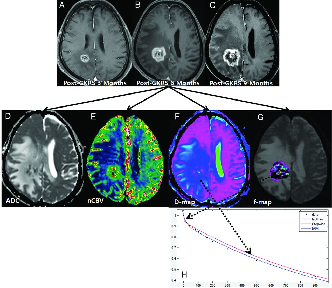 Our study has several limitations. The primary limitation of this initial-experience study was the bias introduced by only including patients clinically suspected of having recurrent tumor or treatment effect. Therefore, some patients with equivocal clinical and image findings that did not meet our clinicoradiologic diagnostic criteria, such as prolonged asymptomatic increases of a contrast-enhancing lesion, were excluded from this study. This exclusion did not allow us to accurately assess sensitivities and specificities for random, consecutive patients. However, this group of patients was the most clinically relevant for accurate noninvasive assessment of post-GKRS metastatic tumors, to minimize unnecessary, additional diagnostic procedures. Second, the number of study patients was relatively small; this size can reduce the statistical power for the superiority of IVIM imaging over other MR imaging techniques. Further prospective analyses with a larger number of patients will be needed to validate our results. Third, because there was no case with histopathologically diagnosed recurrent tumor or radiation necrosis in this study, we would caution against overinterpretation of our study results. A direct image-guided histopathologic correlation for recurrent tumor and radiation necrosis is needed for further validation of IVIM-derived parameters. Such a study may confirm the efficacy of the techniques described in this article.