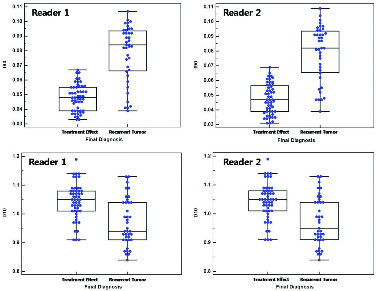 The mean ± SD of f90, D10, nCBV90, and ADC10 in both the recurrent tumor and treatment effect groups are shown in Table 2. The mean f90 showed statistically significant differences between recurrent tumor and treatment effect, with the recurrent tumor group showing a higher f90 (mean of 0.079 versus 0.048 for reader 1 and 0.081 versus 0.046 for reader 2; P < .001 for each). The mean D10 was significantly lower in the recurrent tumor group (mean of 0.970 [10−3mm2s−1] and 0.967 for readers 1 and 2, respectively) than in the treatment effect group (mean of 1.043 and 1.045 for readers 1 and 2, respectively) (P < .001 for each). Figure 4 shows a number of patients in the recurrent tumor group within an overlap zone where misclassifications can occur (10 of 39 patients for reader 1; 12 of 39 patients for reader 2).