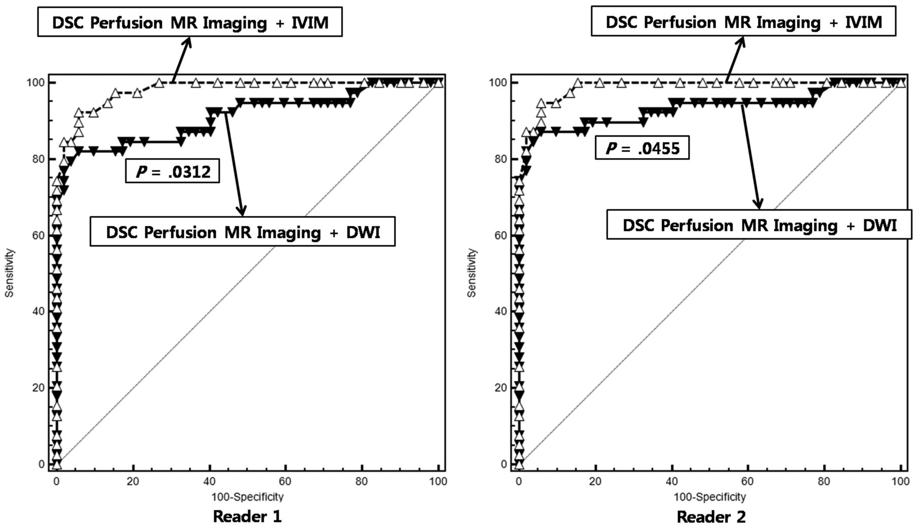 The graph shows the comparison between the receiver operating characteristic curve for the combination of DSC MR imaging and IVIM and for the combination of DSC MR imaging and DWI. The combination of DSC MR imaging and IVIM resulted in a significantly higher area under the receiver operating characteristic curve than the combination of DSC MR imaging and DWI for both readers, thus indicating improved diagnostic performance.