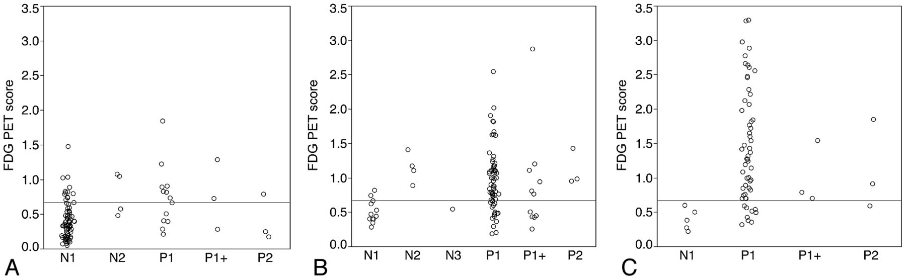 Figure 3 illustrates scatterplots of the FDG-PET scores as contrasted to the combined visual-statistical interpretation determined by the consensus read of 18F-FDG-PET for each clinical group. For each group as well as for all subjects, cases with P1 interpretation showed higher FDG-PET scores than those with N1. Receiver operating characteristic analysis on P1 and N1 cases led to a cutoff FDG-PET score of 0.67 for discrimination between P1 and N1. As was expected, NC cases with P1 interpretation had lower FDG-PET scores than MCI and AD cases with P1 interpretation, and the ratio of the cases above-to-below the cutoff level was also lower. As for the cases with other patterns, a large fraction of the cases with N2 interpretation had FDG-PET scores above the cutoff level, though most were below 1.0. The FDG-PET scores of the cases with P1+ and P2 were variable.