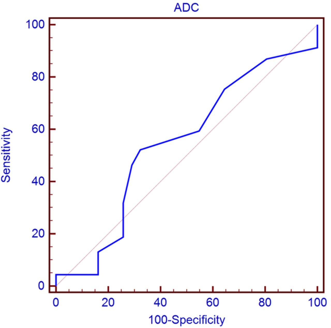 The ROC curve analysis results indicated that the rADC value of 0.54 might be the critical threshold value. With the rADC value of 0.54 set as the diagnostic threshold value, the best sensitivity and specificity for judging FLAIR positivity were 0.52 and 0.68, respectively (Fig 5).