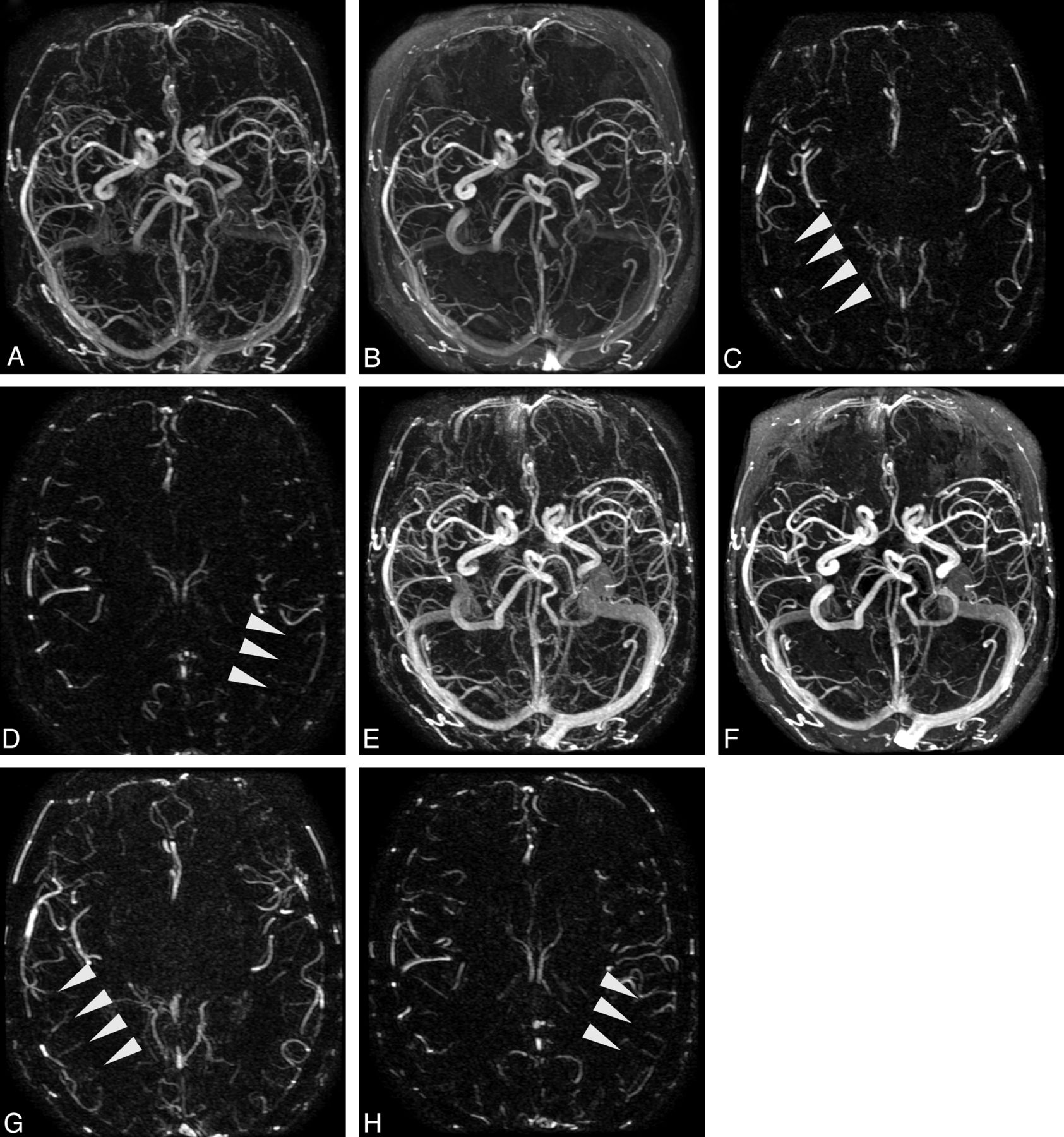 Patient (71-year-old man) undergoing successive TR-MRA, spaced approximately 1 year apart, for evaluation of previously coiled left ophthalmic artery aneurysm. Images obtained after injection of SCA (A–D) and obtained with BPA (E–H). Background-subtracted (A and E) and unsubtracted (B and F) axial MIP volumes from SCA and BPA TR-MRA, respectively; C,G,D, and H are background-subtracted axial source MRA images from peak arterial phases derived from SCA (phase 7) and BPA (phase 9) examinations. Note the improved demonstration of mid and distal MCA branches in both hemispheres with administration of the blood-pool agent.