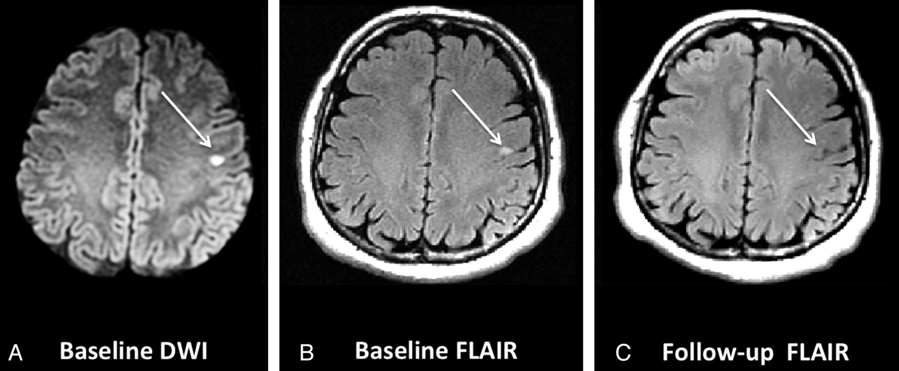 The primary outcome was the rate of DWI reversal on follow-up FLAIR imaging. This was a priori defined as the absence of T2/FLAIR hyperintense signal on follow-up imaging in the region of the brain with the baseline DWI restriction. The patients were not considered to have DWI reversal if there was evidence of atrophy or gliosis in the same region that had DWI restriction or if they showed partial resolution of signal on follow-up imaging (Fig 1). Secondary outcome was the rate of clinical disability as defined by an mRS score of ≥2 at 90-day clinical follow-up.