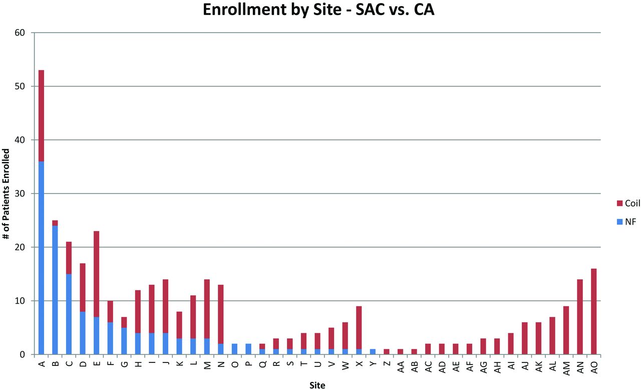 Stent use by enrolling site. SAC indicates stent-assisted coiling, CA, coiling alone, NF, Neuroform stent.