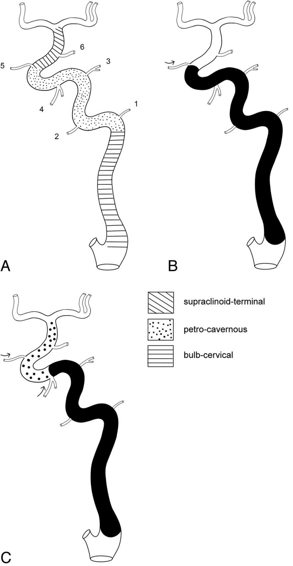 To analyze the occlusion level (site), we applied the embryologic segmental anatomy of the ICA.16 The ICA was divided by the embryologic vascular remnants that can help identify the occlusion level and work as collateral channels, leading to subsequent embolism (Fig 1). The 50 patients were categorized according to occlusion level, based on the 3 most commonly encountered anatomic parts in the ICA segments: supraclinoid-terminal (n = 14), petrocavernous (n = 18), and bulb-cervical (n = 18).