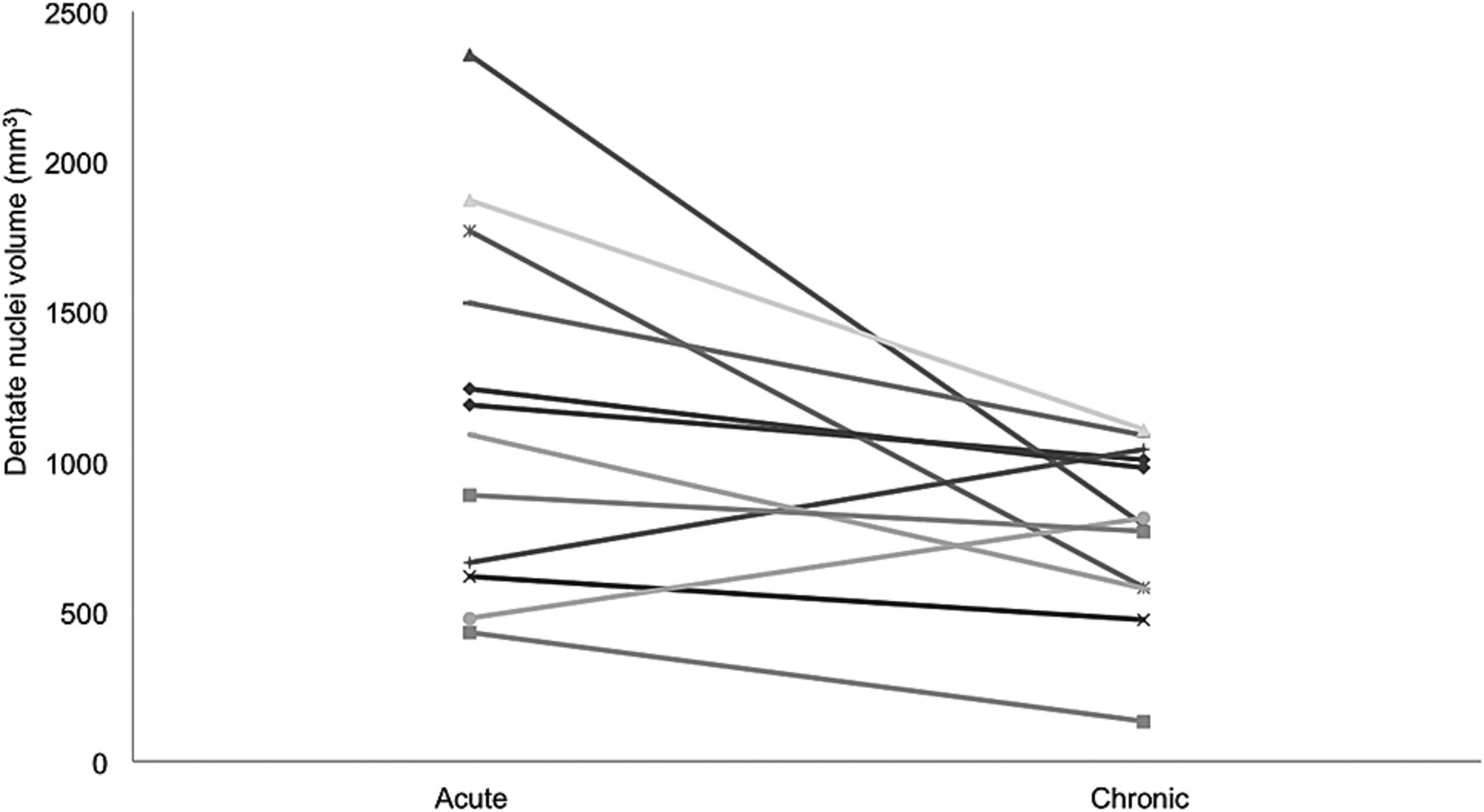 Combined dentate nuclei volume during the acute period compared with the chronic period for each patient.