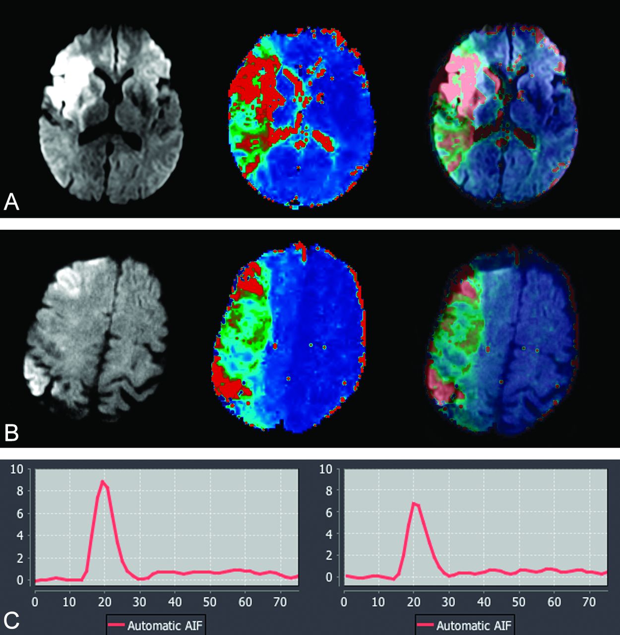 DSC perfusion datasets were processed by use of FDA-approved software (Olea Sphere; Olea Medical, La Ciotat, France). DSC analysis consisted of the following steps: 1) truncation of the first 5 time points in the DSC time-series, 2) calculation of prebolus signal intensity on a voxel wise basis, followed by 3) conversion of truncated DSC time-series to a concentration-time curve on the basis of the T2* relaxivity of the contrast agent. The change in signal intensity with respect to baseline was converted to the change in tissue T2* as a result of contrast agent injection, taken with respect to precontrast baseline time points. The arterial input function (AIF) was selected automatically by the perfusion software, and the deconvoluted perfusion parameters were calculated by use of a block-circulant singular value decomposition technique.14 Quantitative analysis of the AIF curves was performed to determine the peak and full width at half maximum (FWHM). The infarction volume was automatically calculated by means of the software, by use of ADC threshold <600 × 10−6 mm2/s. The time-to-maximum maps, with the use of a threshold of >6 seconds, were evaluated by observers independently in each group to determine the presence of hypoperfusion and DWI-perfusion mismatch by use of a 3-scale scoring system: 1, mismatch present, confident; 2, mismatch may be present, less confident; 3, no mismatch present.