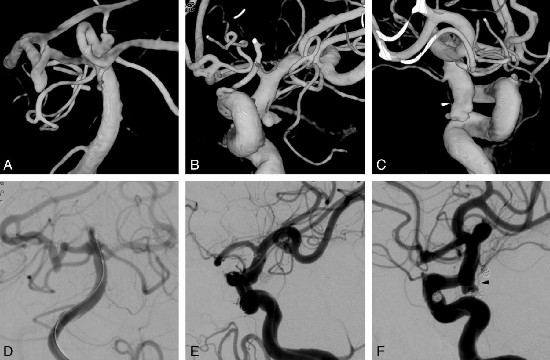 A 61-year-old woman presented with a Hunt and Hess scale grade 3 subarachnoid hemorrhage. Nonenhanced CT (not shown) showed a diffuse, nonlocalized, subarachnoid hemorrhage in the entire basal cistern. 3D reconstruction images of cerebral angiography reveal 3 similar-sized small aneurysms at the left superior cerebellar artery origin (A) and bilateral posterior communicating artery origin (B and C). Each of the 3 aneurysms also has an irregular shape with a daughter sac. The white arrowhead indicates a left tuberothalamic artery incorporated into the aneurysm sac. Postembolization control angiograms after balloon-assisted coiling for all 3 aneurysms show complete occlusion of the superior cerebellar artery (D) and the left posterior communicating artery (E) aneurysms, and an intentional neck remnant, from which a left tuberothalamic artery (black arrowhead) directly originated, of the right posterior communicating artery aneurysm (F).
