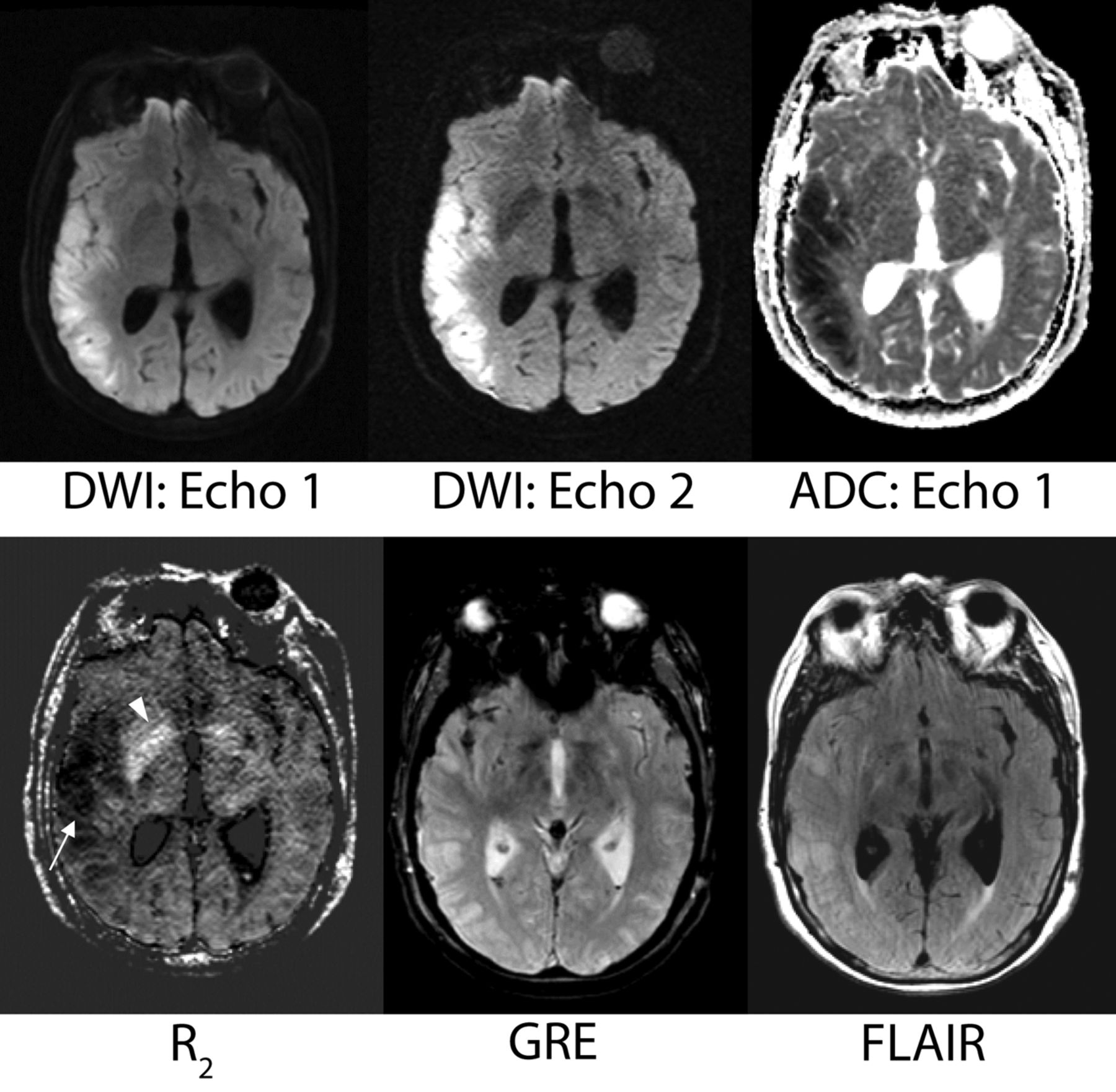 CONCLUSIONS: Parallel imaging–enhanced dual-echo diffusion-weighted EPI is a useful method for evaluating lesions with reduced diffusivity. The long TE of echo 2 produced DWIs that exhibited superior lesion conspicuity compared with images acquired at a shorter TE. Echo 1 provided higher SNR ADC maps for specificity to acute infarction. The relaxivity maps may serve to complement information regarding blood products and mineralization.