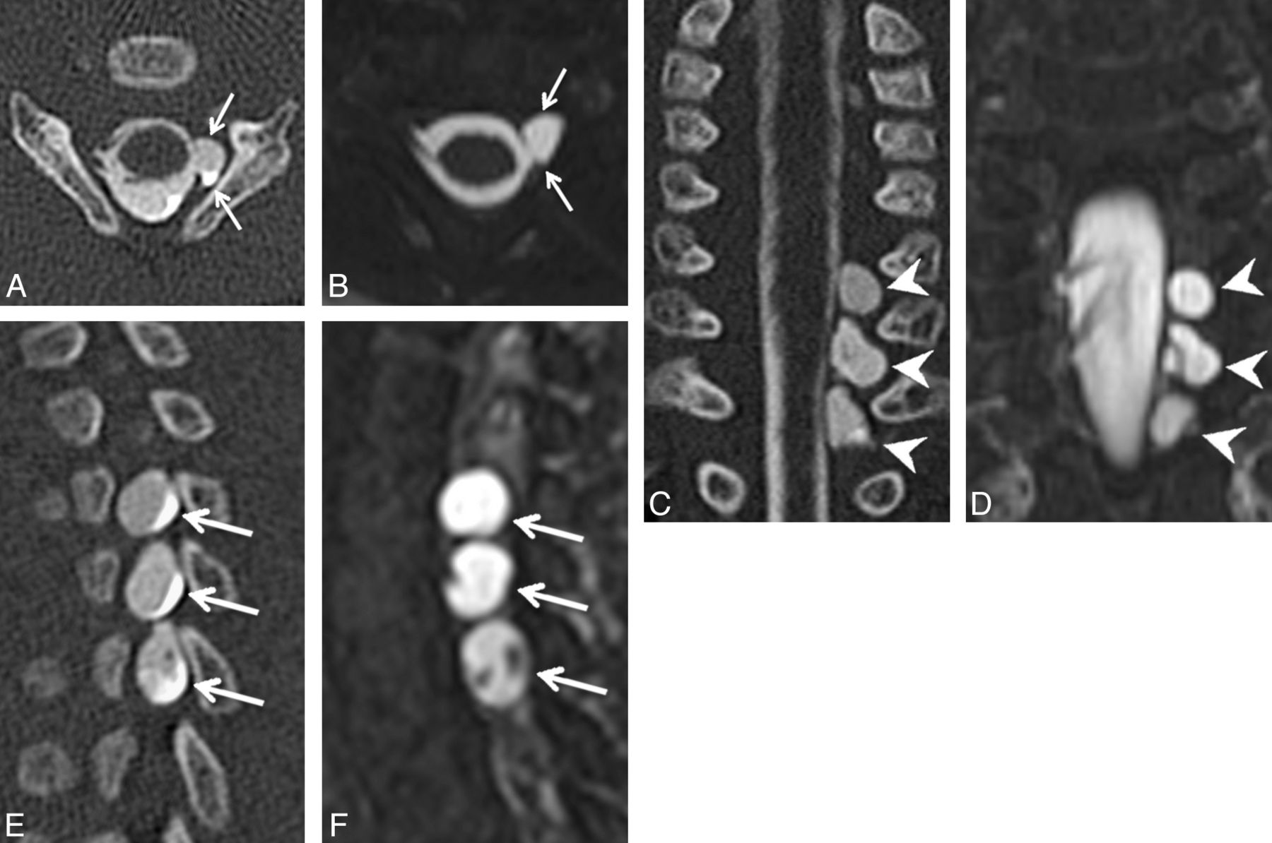 Axial (A), coronal (C), and left parasagittal (E) images from a CT myelogram and corresponding axial (B), coronal (D), and left parasagittal (F) images from an MR myelogram (B, D, and F) on the same patient demonstrating 3 consecutive left-sided pseudomeningoceles with absent rootlets at C7–T1 (arrows in A and B, arrowheads in C and D, arrows in E and F). Note the internal septa within the middle and lower pseudomeningoceles that can simulate intact rootlets on a single image.