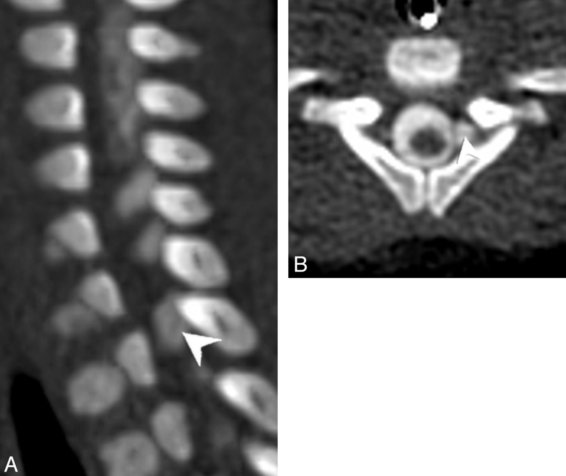 Left parasagittal (A) and axial (B) images from a CT myelogram demonstrating a left-sided pseudomeningocele at T1. A thin linear filling defect within the pseudomeningocele continued centrally to the cord and was interpreted as an intact nerve root.