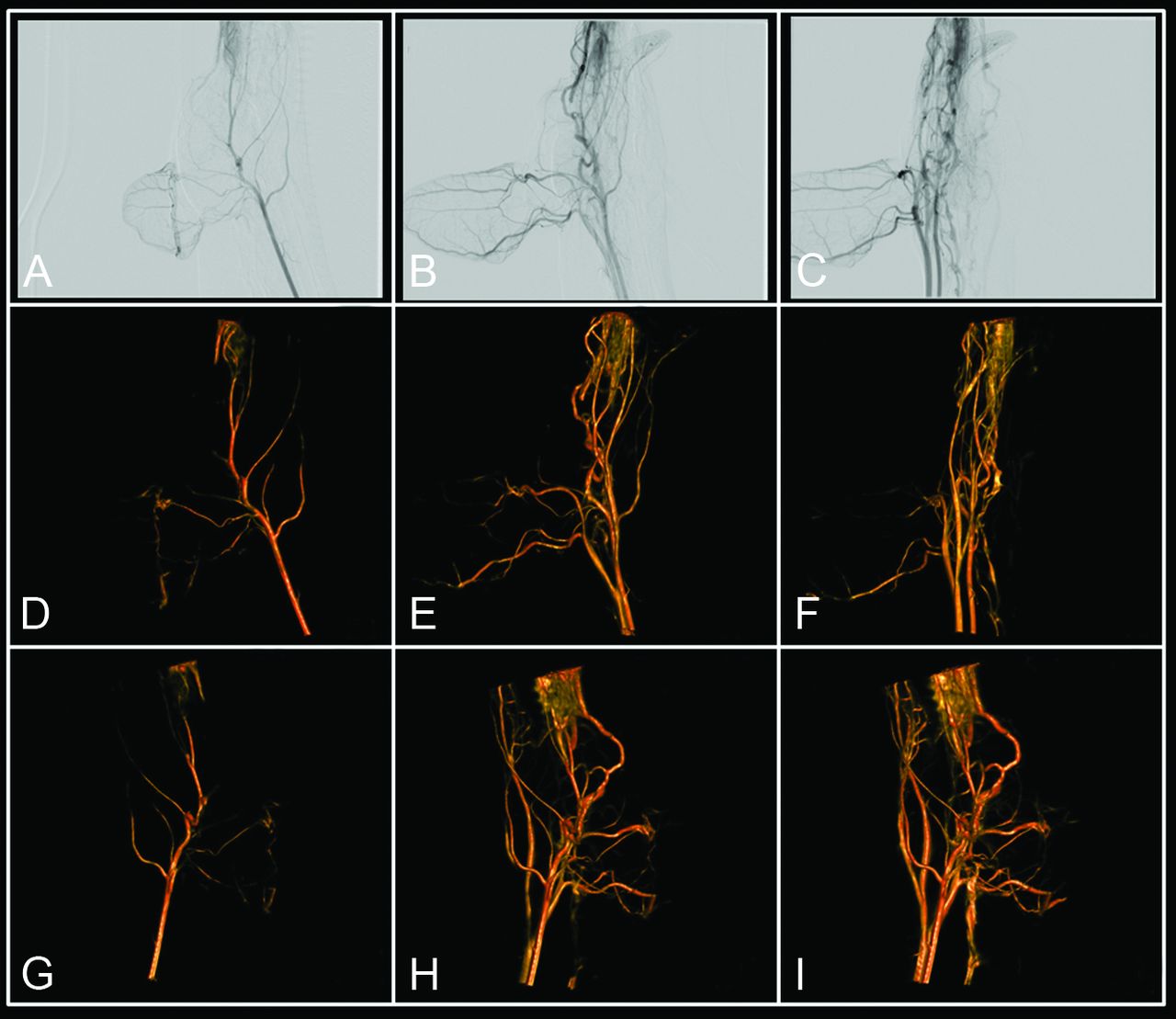 Illustration of 4D DSA reconstruction. No x-ray delay between contrast injection and rotational image acquisition results in contrast flow or inflow being visible in the rotational projections (A–C). Through a 2-step reconstruction process, this flow information is encoded into the 3D DSA for every projection, effectively creating a 4D DSA. This allows viewing of the contrast bolus passage at any desired angle at any time during the bolus passage. D–F, View of the bolus passage at 3 projection angles at 3 different time points. G–I, View of the bolus passage at 3 angles not present in the projections, again at 3 different time points. The figures correspond to sample angle projections selected to match the 2D acquisitions, even though once 4D images are reconstructed, views are available from any angle.