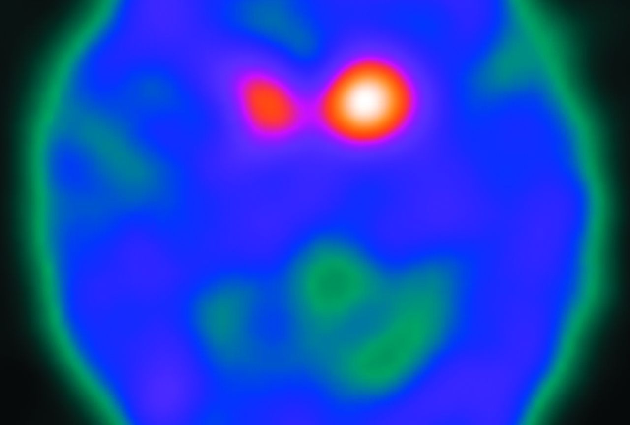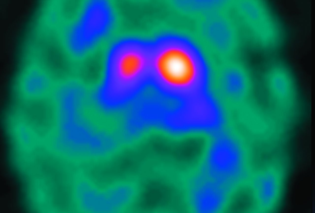 Axial 123I-FP-CIT DaT SPECT image in a patient with corticobasal degeneration. There is uniform striatal reduction in tracer activity with marked hemispheric asymmetry on the left. However, in many cases, imaging appearances can be indistinguishable from those in idiopathic Parkinson disease, MSA, or PSP. Image courtesy of Dr Roberto Ceravolo, Department of Neurosciences, University of Pisa, Italy.45