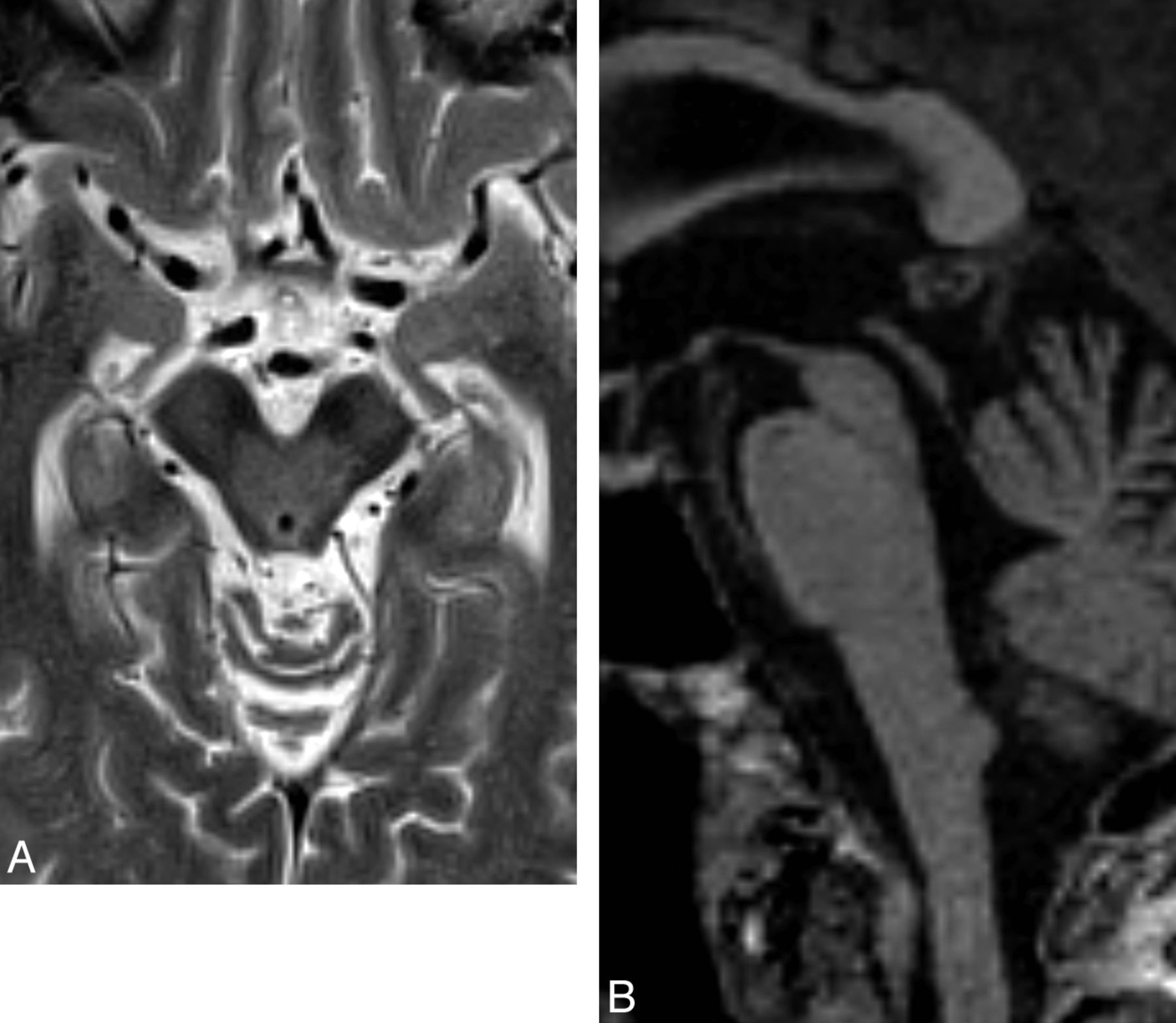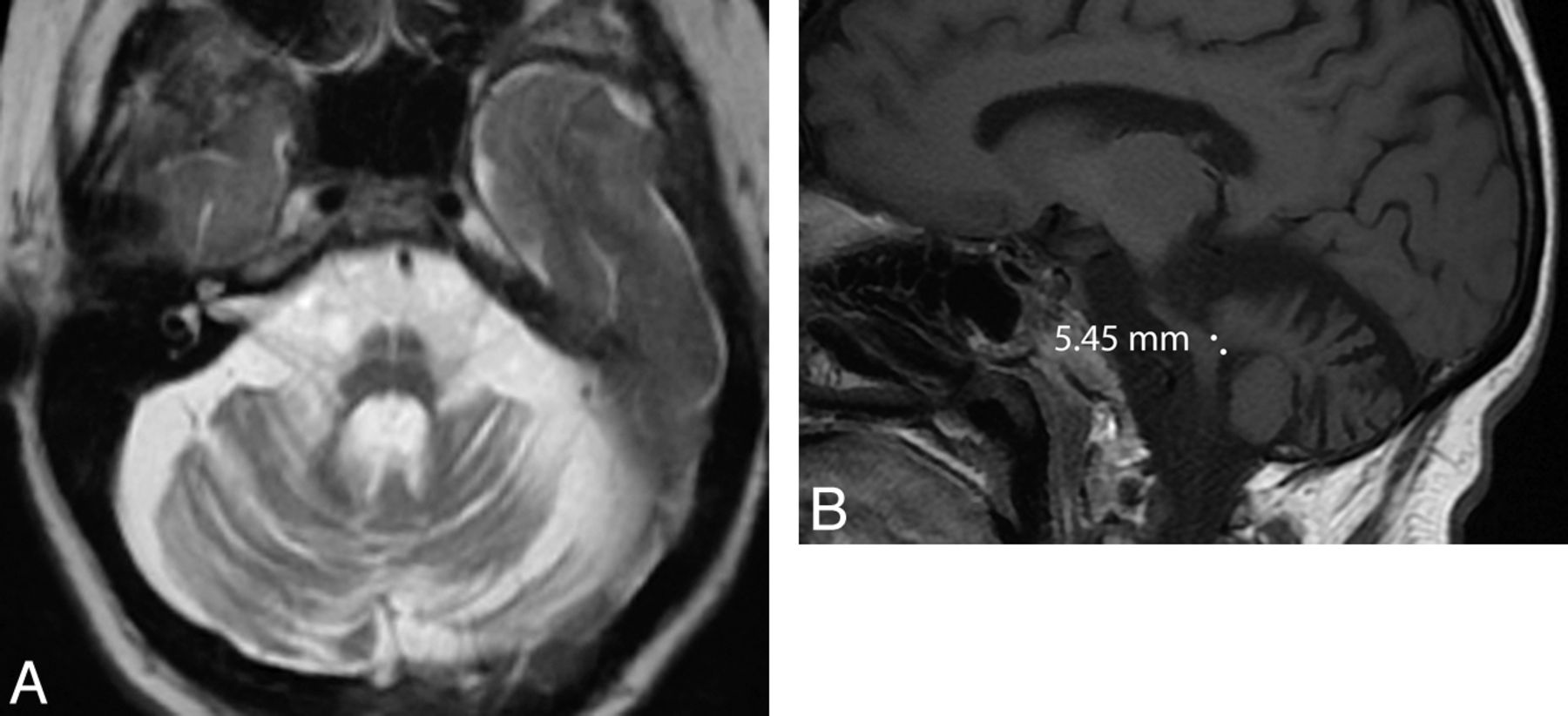 Axial T2-weighted MR imaging sequence in a patient with MSA with predominant cerebellar ataxia (A) demonstrating the “hot-cross bun” sign, which results from selective loss of myelinated pontine transverse fibers and raphe neurons. One study showed that the sign is 100% specific in differentiating patients with MSA from those with idiopathic Parkinson disease; however, it is only 50% sensitive.6 Marked pontine and cerebellar atrophy is also demonstrated. This olivopontocerebellar volume loss is shown on the sagittal T1-weighted sequences (B), where a middle cerebellar peduncle width <8 mm is demonstrated. All these signs are nonspecific in the wider population—for example, they can be seen in some spinocerebellar ataxia subtypes.