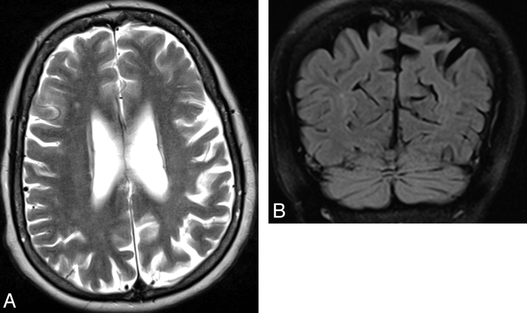 Axial T2-weighted MR imaging sequence in a patient with CBD (A) demonstrating asymmetric frontoparietal atrophy. The corresponding coronal FLAIR sequence (B) shows the asymmetric superior parietal lobules.