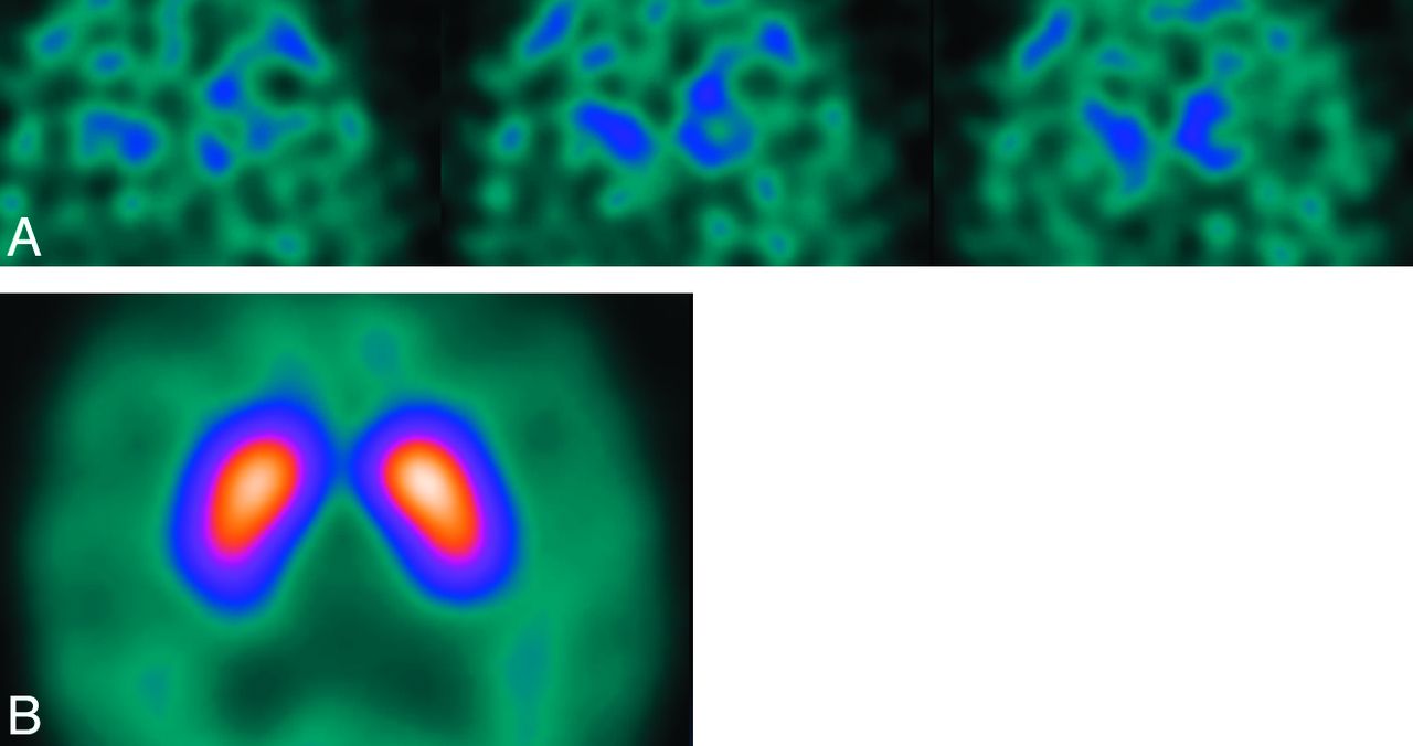 Postmortem studies have shown normal levels of putaminal dopamine in Alzheimer disease compared with a 72% reduction in dementia with Lewy bodies.57 This finding is reflected in DaT-SPECT studies that show an asymmetric reduction in DAT binding in dementia with Lewy bodies compared with a normal appearance in Alzheimer disease, allowing differentiation with 90% positive predictive value (Fig 9).39,58 It is particularly important to exclude dementia with Lewy bodies if the patient requires treatment for hallucinations. Otherwise, a parkinsonian crisis may be precipitated in a patient with dementia with Lewy bodies because some neuroleptic drugs block the postsynaptic D2 receptor, thereby exacerbating the shortage of dopamine within the synaptic cleft. More than half of such patients will have severe adverse reactions, some of which are fatal.49
