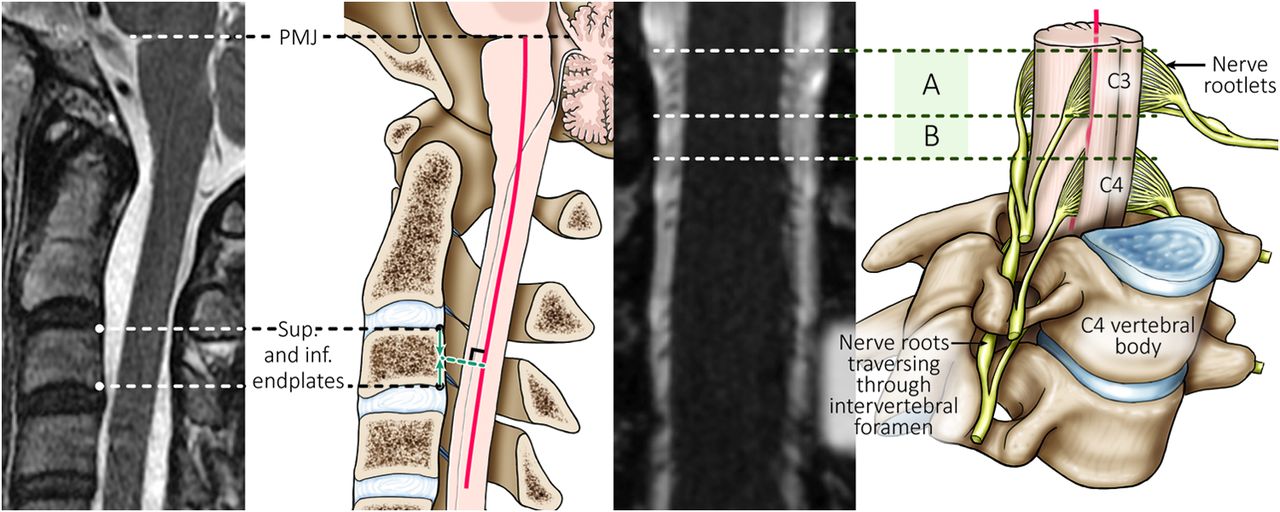 From left to right: T2-weighted MR image with the PMJ and superior (Sup.) and inferior (inf.) endplates of the C3 vertebral body marked with dashed white lines. Immediately adjacent to this, an artist's illustration demonstrates how person-specific markings are positioned relative to the individualized arc-length axis of the spinal cord (red line). Thus, distances can be compared across individuals along their personalized spinal cord axes. The T2-weighted coronal image depicts spinal rootlets (A) and the gap between adjacent segmental rootlets (B), delineated by dashed white lines. The far right artist's illustration depicts segmental rootlets and the formation of a spinal nerve root that emerges from the intervertebral foramen. To accurately localize segmental nerve rootlets, we followed the spinal nerve root that emerges from the intervertebral foramen of the respective vertebral body.