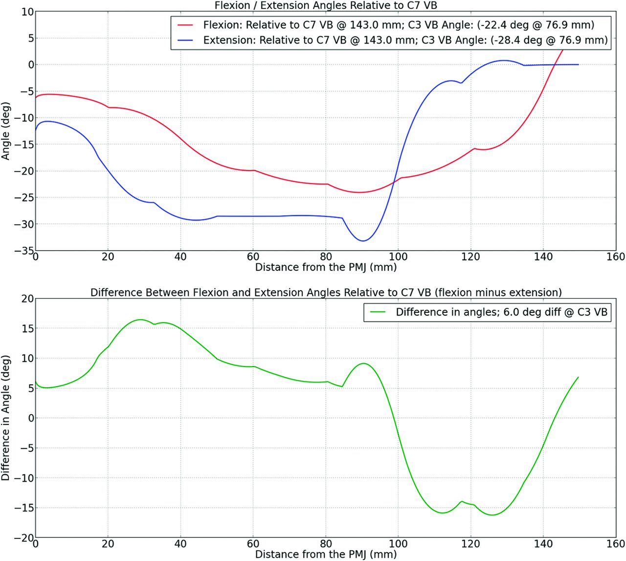 Automated analysis of the degree of neck flexion/extension of a subject. Top: the angle between the tangent of the spinal cord at any point and tangent at the C7 vertebral body for 1 subject with the neck in flexion (red) and extension (blue). Bottom: the difference between the flexion and extension curves or the maximum extent of curvature of the spinal cord at various locations down the longitudinal axis of the spinal cord (x-axis). VB indicates vertebral body; deg, degree; deg diff, degree difference.