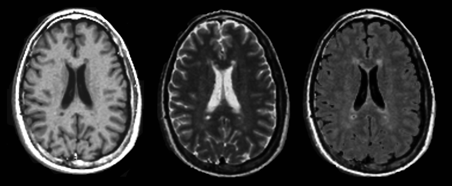 Synthetic T1WI (left), T2WI (middle), and T2-weighted FLAIR (right) imaging, postsynthesized from the quantitative MR imaging scan in a patient with MS.