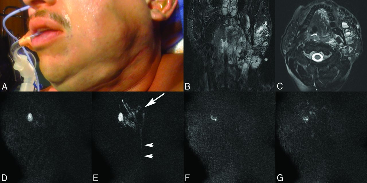 A 36-year-old man with a left facial venous malformation who undergone 14 treatments during the past 3 years, the last 2 with MR imaging guidance. Overview of the direct-injection MR angiography technique for embolization of the lesion. A, Patient photograph before MR sclerotherapy shows left facial swelling from a persistent left facial venous malformation. Coronal (B) and axial (C) T2-weighted fat-saturated MR images demonstrate the typical imaging characteristics of a venous vascular malformation, including a mixed signal intensity but mostly bright trans-spatial lesion extending both superficial and deep to the left mandible composed of multiloculated blood-filled channels with fluid-fluid levels producing local mass effect. Pretreatment MR angiograms, early (D) and late (E) phase, show appropriate needle positioning within the loculated blood-filled channels of the venous malformation (arrow) with slow venous runoff into a small draining vein (arrowheads). Posttreatment MR angiograms, early (F) and late (G) phase, demonstrate pruning of the vascular channels of the venous malformation with markedly diminished flow into the draining vein, compatible with satisfactory embolization of the lesion.