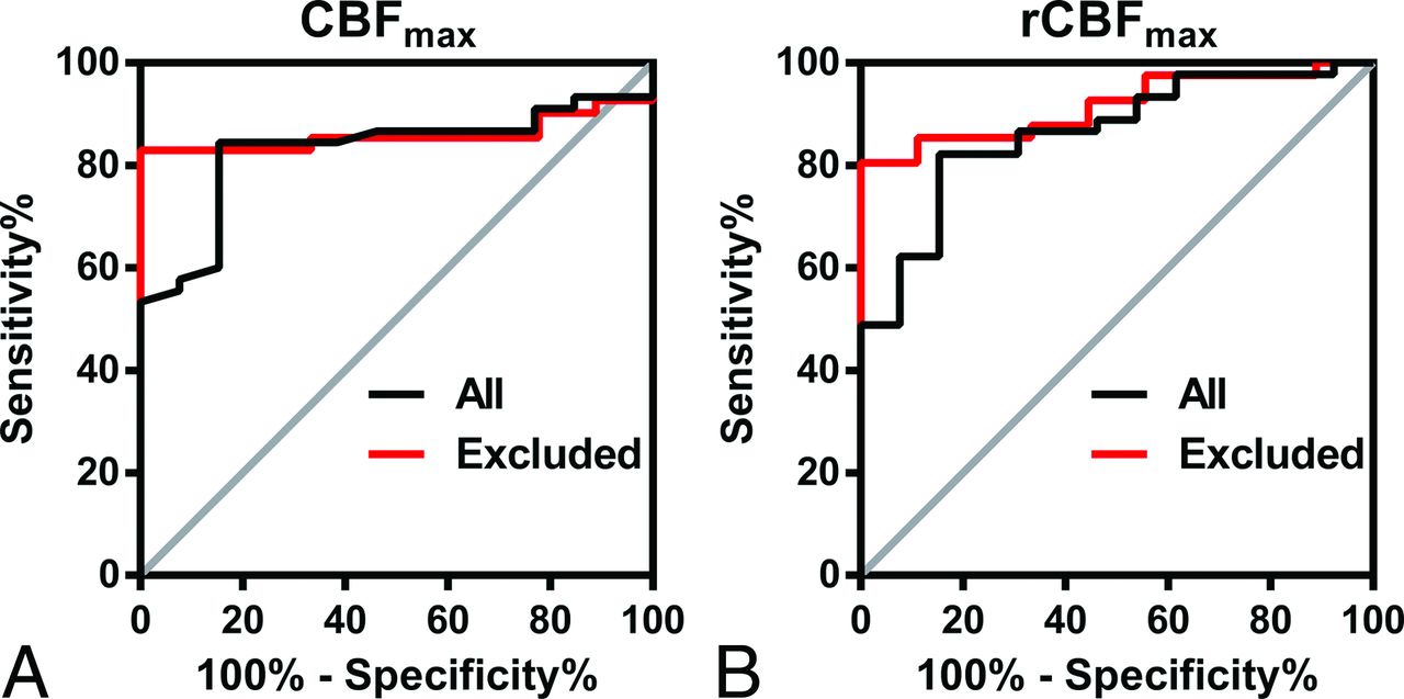 Receiver operating characteristic curves of CBFmax (A) and rCBFmax (B) in distinguishing high- from low-grade gliomas, without (black line) or with (red line) oligodendrogliomas and anaplastic oligodendrogliomas excluded.