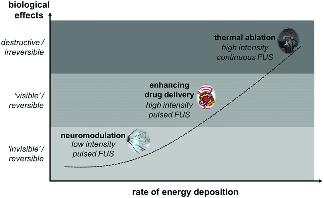 Unique biologic effects can be achieved over a range of energy-deposition rates by manipulating the intensity and duty cycle of the ultrasound application. These include neuromodulation, localized reversible enhancement of blood-brain barrier permeability, and thermal ablation.