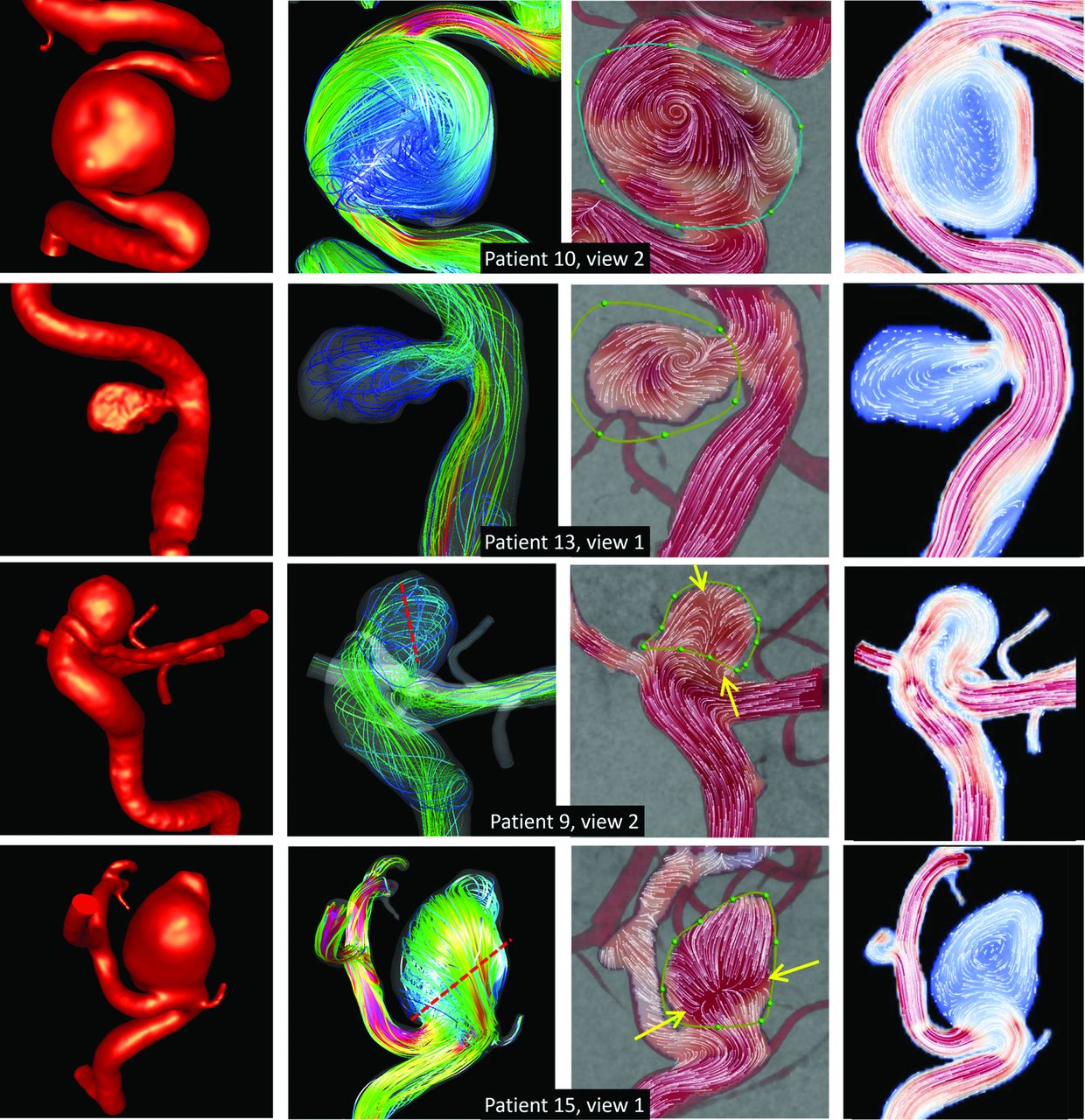 Visualization of in vivo aneurysmal flow structures and quantification of aneurysm hemodynamic characteristics is important in understanding the role of hemodynamics in the mechanisms responsible for wall degeneration and progression toward rupture or stabilization1 as well as for evaluating endovascular procedures such as flow diversion.2,3
